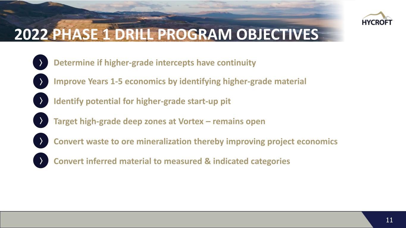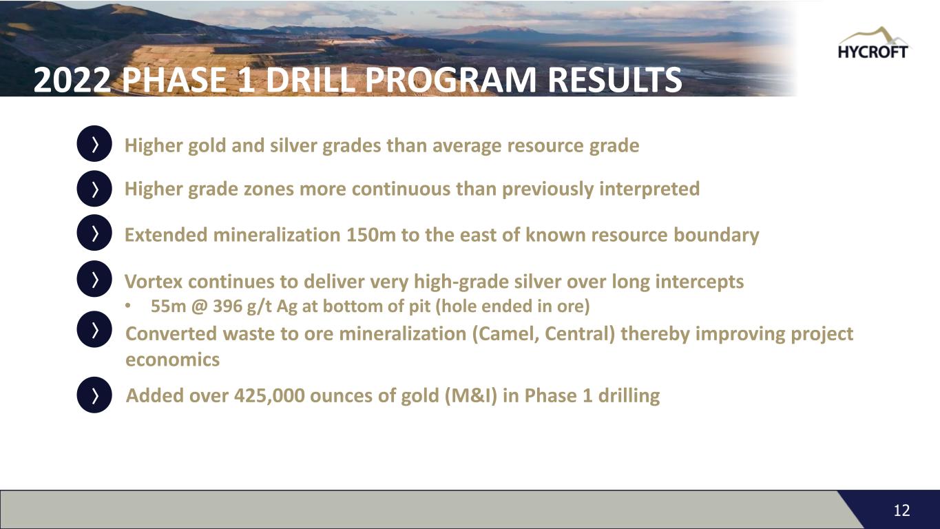 2022 PHASE 1 DRILL PROGRAM OBJECTIVES Determine if higher-grade intercepts have continuity 〉 11 Improve Years 1-5 economics by identifying higher-grade material 〉 〉\ 〉 Convert waste to ore mineralization thereby improving project economics〉 Convert inferred material to measured & indicated categories〉 Identify potential for higher-grade start-up pit Target high-grade deep zones at Vortex – remains open 〉
