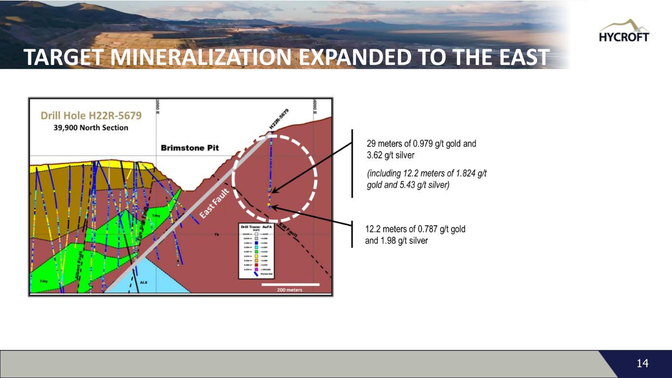 2022 Phase 1 Drill Program – Brimstone Highlights 13 〉 1 See website for additional drill results FROM TO INTERVAL (meters) (meters) (meters) Au (g/t)  Ag (g/t) Brimstone H22R-5650 0 82 82 1.03 30.38 including 21 24 3 1.20 163.51 H22R-5644 37 87 50 0.79 38.74 including 74 79 5 2.23 84.69 H22R-5645 27 47 20 0.10 90.86 including 114 148 34 3.77 16.77 H22R-5648 195 229 34 0.40 9.86 314 503 189 1.06 58.33 including 337 404 67 1.15 72.86 including 369 401 32 0.40 107.14 451 462 11 1.39 354.29 H22R-5671 26 61 35 2.83 35.59 including 38 55 17 4.81 48.53 78 87 9 0.71 16.35 159 177 18 0.78 45.34 394 408 14 0.29 102.92 H22R-5679 221 250 29 0.98 3.62 including 238 250 12 1.82 5.43 Hole ID GRADE