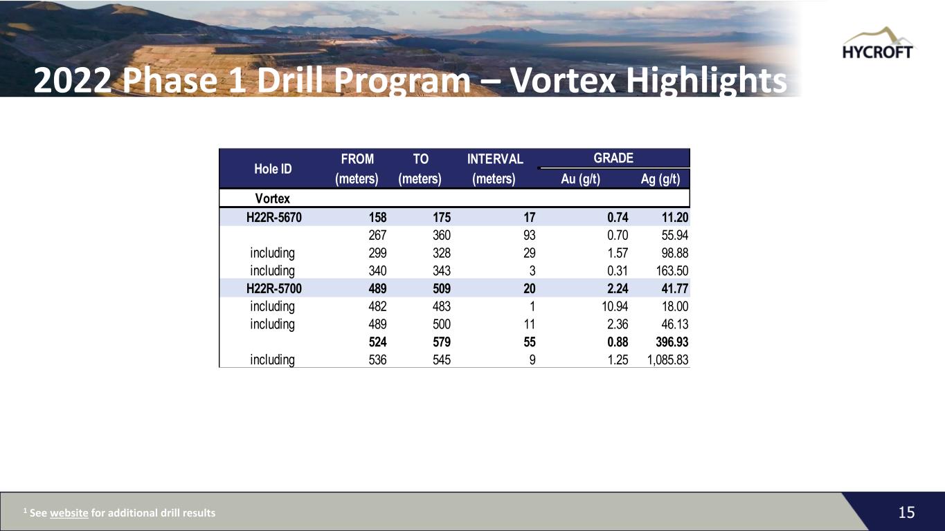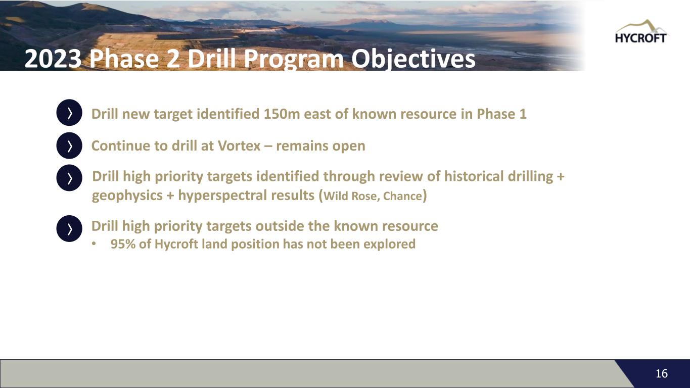 2022 Phase 1 Drill Program – Vortex Highlights 15 〉 1 See website for additional drill results FROM TO INTERVAL (meters) (meters) (meters) Au (g/t)  Ag (g/t) Vortex H22R-5670 158 175 17 0.74 11.20 267 360 93 0.70 55.94 including 299 328 29 1.57 98.88 including 340 343 3 0.31 163.50 H22R-5700 489 509 20 2.24 41.77 including 482 483 1 10.94 18.00 including 489 500 11 2.36 46.13 524 579 55 0.88 396.93 including 536 545 9 1.25 1,085.83 Hole ID GRADE