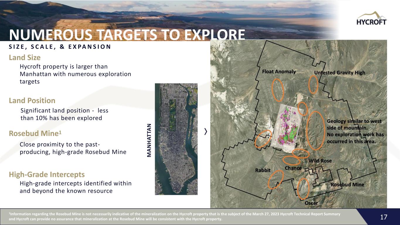 2023 Phase 2 Drill Program Objectives Drill new target identified 150m east of known resource in Phase 1〉 〉 16 Continue to drill at Vortex – remains open 〉 〉\ Drill high priority targets outside the known resource • 95% of Hycroft land position has not been explored 〉 Drill high priority targets identified through review of historical drilling + geophysics + hyperspectral results (Wild Rose, Chance)