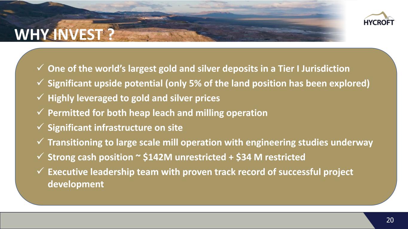 ATTRACTIVE INVESTMENT ENTRY POINT Source: BMO Capital Markets HYCROFT CURRENTLY TRADES AT A SIGNIFICANT DISCOUNT TO OTHER LARGE-SCALE NORTH AMERICAN PRECIOUS METALS DEVELOPERS 19 Study Prices: $1,900/oz Au | $24.50/oz Ag