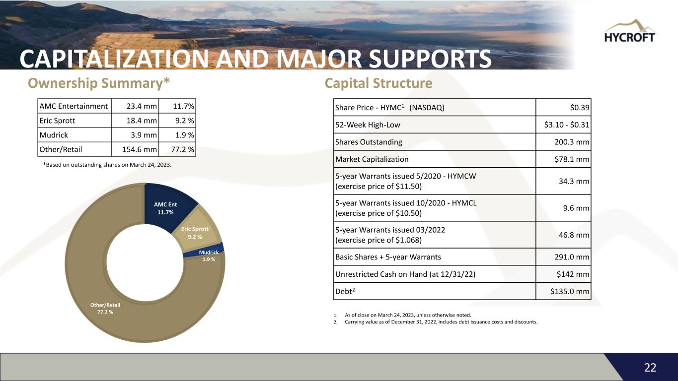 CAPITALIZATION AND MAJOR SUPPORTS Ownership Summary* AMC Entertainment 23.4 mm 11.7% Eric Sprott 18.4 mm 9.2 % Mudrick 3.9 mm 1.9 % Other/Retail 154.6 mm 77.2 % 1. As of close on March 24, 2023, unless otherwise noted. 2. Carrying value as of December 31, 2022, includes debt issuance costs and discounts. Capital Structure *Based on outstanding shares on March 24, 2023. 22 AMC Ent 11.7% Eric Sprott 9.2 % Mudrick 1.9 % Other/Retail 77.2 % Share Price - HYMC1. (NASDAQ) $0.39 52-Week High-Low $3.10 - $0.31 Shares Outstanding 200.3 mm Market Capitalization $78.1 mm 5-year Warrants issued 5/2020 - HYMCW (exercise price of $11.50) 34.3 mm 5-year Warrants issued 10/2020 - HYMCL (exercise price of $10.50) 9.6 mm 5-year Warrants issued 03/2022 (exercise price of $1.068) 46.8 mm Basic Shares + 5-year Warrants 291.0 mm Unrestricted Cash on Hand (at 12/31/22) $142 mm Debt2 $135.0 mm A C Ent 11.7% Eric Sprott 9.2 % udrick 1.9 % Other/Retail 77.2 %