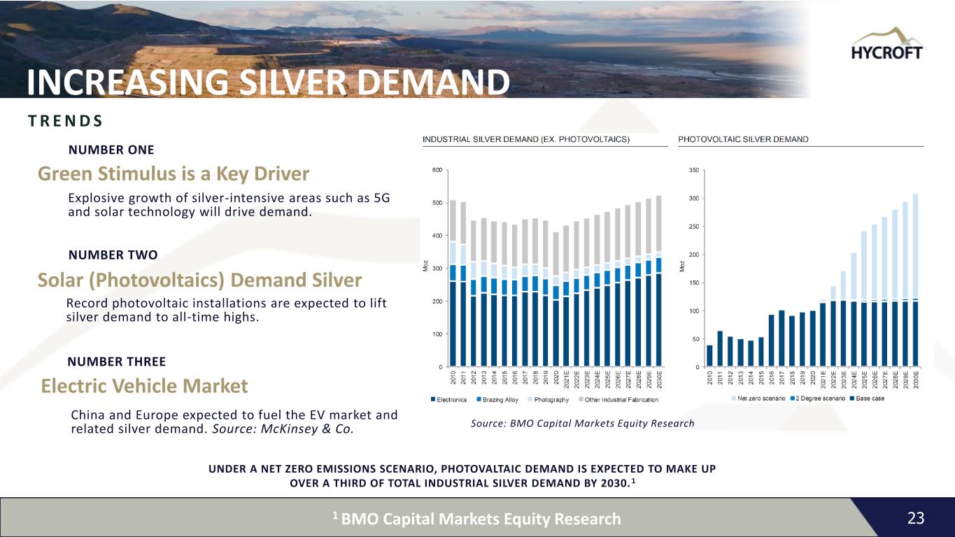 UNDER A NET ZERO EMISSIONS SCENARIO, PHOTOVALTAIC DEMAND IS EXPECTED TO MAKE UP OVER A THIRD OF TOTAL INDUSTRIAL SILVER DEMAND BY 2030. 1 NUMBER ONE Green Stimulus is a Key Driver Explosive growth of silver-intensive areas such as 5G and solar technology will drive demand. NUMBER TWO Solar (Photovoltaics) Demand Silver Record photovoltaic installations are expected to lift silver demand to all-time highs. NUMBER THREE Electric Vehicle Market China and Europe expected to fuel the EV market and related silver demand. Source: McKinsey & Co. Source: BMO Capital Markets Equity Research 1 BMO Capital Markets Equity Research T R E N D S INCREASING SILVER DEMAND 23