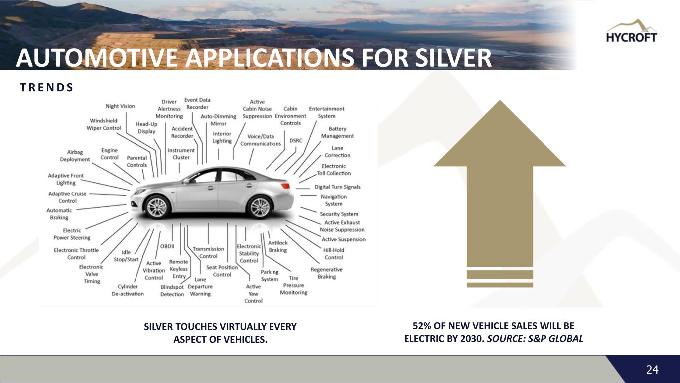 T R E N D S SILVER TOUCHES VIRTUALLY EVERY ASPECT OF VEHICLES. 52% OF NEW VEHICLE SALES WILL BE ELECTRIC BY 2030. SOURCE: S&P GLOBAL AUTOMOTIVE APPLICATIONS FOR SILVER 24