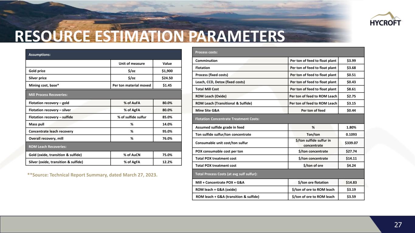26 MINERAL RESOURCES Mineral resources based on metal prices of $1,900/oz Au and $24.50/oz Ag. Cutoffs are income – process cost = NPR = NSR – Process OpEx. Numbers may not match exactly due to rounding. Mineral resources are contained within a computer-generated optimized pit. All units are metric. Gold and silver grades are in grams / metric ton **Source: Technical Report Summary, dated March 27, 2023. Approximate Contained Ounces Classification Cutoff, Equiv Gold Silver Sulfide Gold Silver Gold gm/t Ktonnes gm/tonne gm/tonne Sulfur% Ozs x 1000 Ozs x 1000 Heap Leach Resource Measured 0.07 85,424 0.274 5.72 2.14 753 15,725 Indicated 0.07 54,206 0.250 4.32 1.78 436 7,529 Meas + Ind 0.07 139,630 0.265 5.17 2.00 1,189 23,254 Inferred 0.07 41,838 0.250 4.86 1.62 337 6,549 Flotation Mill + Concentrate Treatment by POX and Cyanide Leach Measured 0.34 365,361 0.445 17.09 1.78 5,236 200,965 Indicated 0.34 314,171 0.411 13.49 1.58 4,156 136,445 Meas + Ind 0.34 679,532 0.429 15.43 1.69 9,391 337,410 Inferred 0.34 226,341 0.414 12.29 1.52 3,019 89,568 Combined Mineral Resources, Leach Plus Mill Total Measured 0.07-0.34 450,785 0.413 14.93 1.85 5,989 216,690 Total Indicated 0.07-0.34 368,377 0.387 12.14 1.61 4,592 143,974 Total Meas + Ind 0.07-0.34 819,162 0.401 13.68 1.74 10,581 360,664 Total Inferred 0.07-0.34 268,179 0.389 11.14 1.54 3,356 96,117