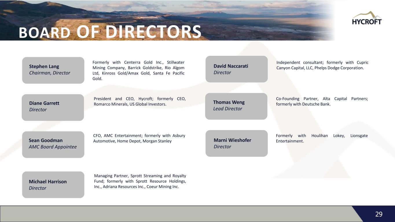 BOARD OF DIRECTORS Stephen Lang Chairman, Director Formerly with Centerra Gold Inc., Stillwater Mining Company, Barrick Goldstrike, Rio Algom Ltd, Kinross Gold/Amax Gold, Santa Fe Pacific Gold. Diane Garrett Director President and CEO, Hycroft; formerly CEO, Romarco Minerals, US Global Investors. Sean Goodman AMC Board Appointee CFO, AMC Entertainment; formerly with Asbury Automotive, Home Depot, Morgan Stanley Michael Harrison Director Managing Partner, Sprott Streaming and Royalty Fund; formerly with Sprott Resource Holdings, Inc., Adriana Resources Inc., Coeur Mining Inc. David Naccarati Director Independent consultant; formerly with Cupric Canyon Capital, LLC, Phelps Dodge Corporation. Thomas Weng Lead Director Co-Founding Partner, Alta Capital Partners; formerly with Deutsche Bank. Marni Wieshofer Director Formerly with Houlihan Lokey, Lionsgate Entertainment. 29