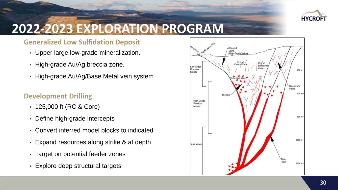 2022-2023 EXPLORATION PROGRAM 30 Generalized Low Sulfidation Deposit • Upper large low-grade mineralization. • High-grade Au/Ag breccia zone. • High-grade Au/Ag/Base Metal vein system Development Drilling • 125,000 ft (RC & Core) • Define high-grade intercepts • Convert inferred model blocks to indicated • Expand resources along strike & at depth • Target on potential feeder zones • Explore deep structural targets Hycroft Hycroft