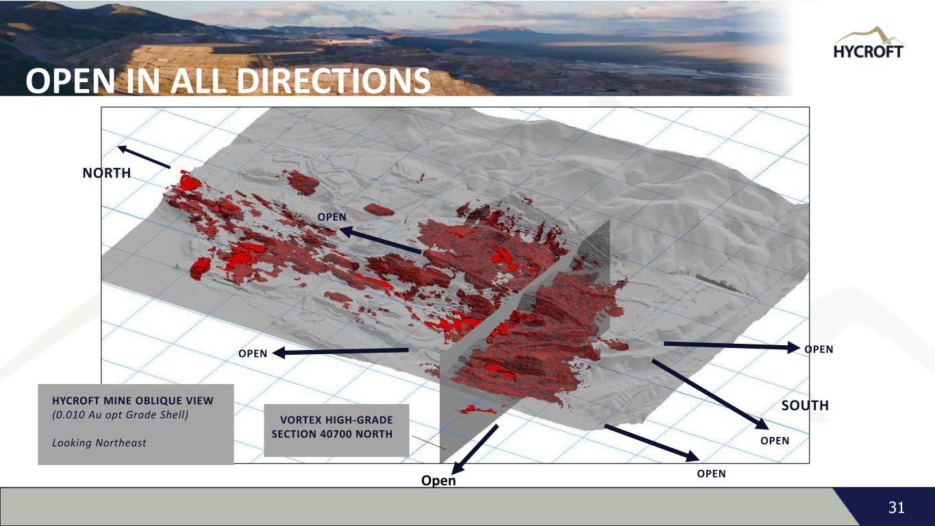 OPEN IN ALL DIRECTIONS 2000 Feet Open HYCROFT MINE OBLIQUE VIEW (0.010 Au opt Grade Shell) Looking Northeast VORTEX HIGH-GRADE SECTION 40700 NORTH OPEN OPEN OPEN OPEN OPEN SOUTH NORTH 31
