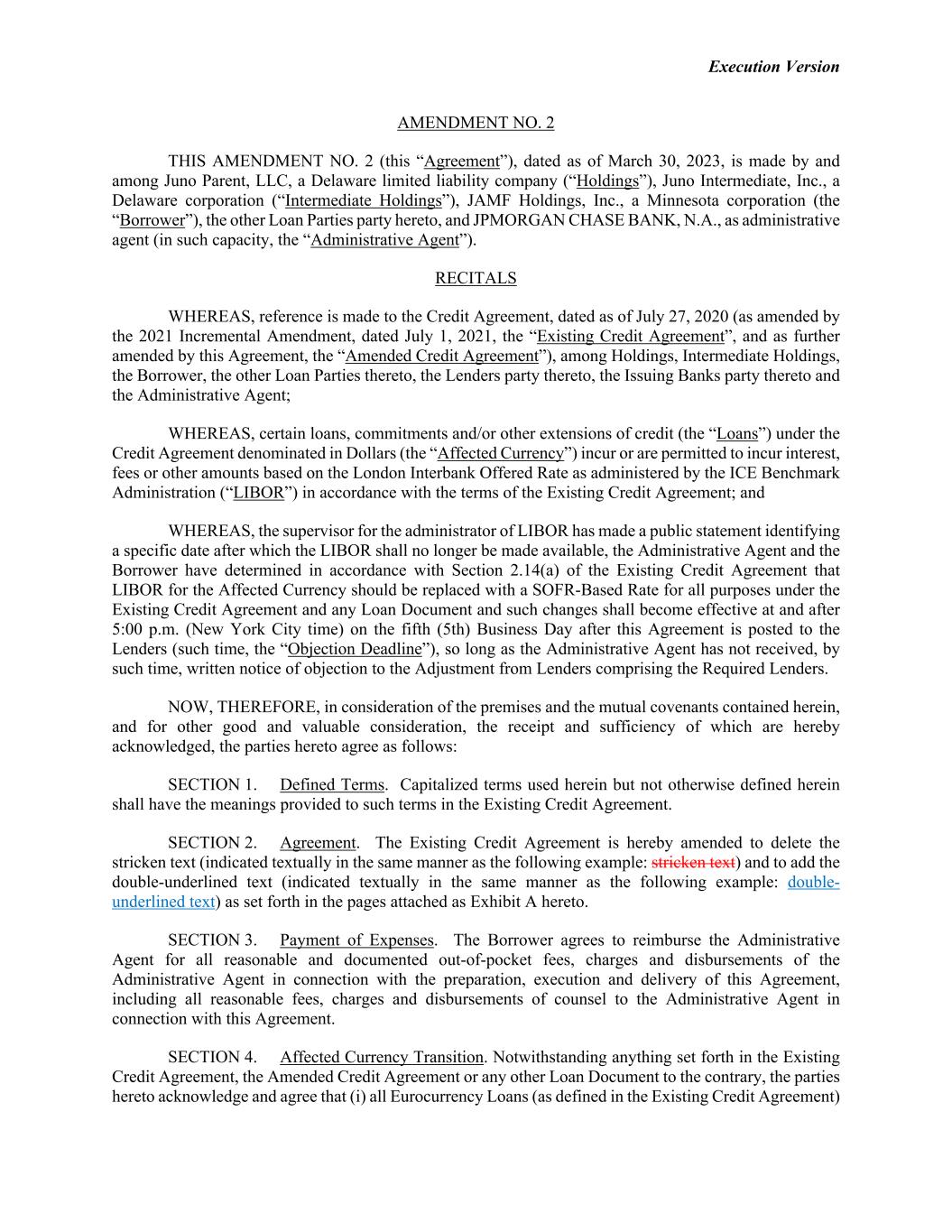 Execution Version AMENDMENT NO. 2 THIS AMENDMENT NO. 2 (this “Agreement”), dated as of March 30, 2023, is made by and among Juno Parent, LLC, a Delaware limited liability company (“Holdings”), Juno Intermediate, Inc., a Delaware corporation (“Intermediate Holdings”), JAMF Holdings, Inc., a Minnesota corporation (the “Borrower”), the other Loan Parties party hereto, and JPMORGAN CHASE BANK, N.A., as administrative agent (in such capacity, the “Administrative Agent”). RECITALS WHEREAS, reference is made to the Credit Agreement, dated as of July 27, 2020 (as amended by the 2021 Incremental Amendment, dated July 1, 2021, the “Existing Credit Agreement”, and as further amended by this Agreement, the “Amended Credit Agreement”), among Holdings, Intermediate Holdings, the Borrower, the other Loan Parties thereto, the Lenders party thereto, the Issuing Banks party thereto and the Administrative Agent; WHEREAS, certain loans, commitments and/or other extensions of credit (the “Loans”) under the Credit Agreement denominated in Dollars (the “Affected Currency”) incur or are permitted to incur interest, fees or other amounts based on the London Interbank Offered Rate as administered by the ICE Benchmark Administration (“LIBOR”) in accordance with the terms of the Existing Credit Agreement; and WHEREAS, the supervisor for the administrator of LIBOR has made a public statement identifying a specific date after which the LIBOR shall no longer be made available, the Administrative Agent and the Borrower have determined in accordance with Section 2.14(a) of the Existing Credit Agreement that LIBOR for the Affected Currency should be replaced with a SOFR-Based Rate for all purposes under the Existing Credit Agreement and any Loan Document and such changes shall become effective at and after 5:00 p.m. (New York City time) on the fifth (5th) Business Day after this Agreement is posted to the Lenders (such time, the “Objection Deadline”), so long as the Administrative Agent has not received, by such time, written notice of objection to the Adjustment from Lenders comprising the Required Lenders. NOW, THEREFORE, in consideration of the premises and the mutual covenants contained herein, and for other good and valuable consideration, the receipt and sufficiency of which are hereby acknowledged, the parties hereto agree as follows: SECTION 1. Defined Terms. Capitalized terms used herein but not otherwise defined herein shall have the meanings provided to such terms in the Existing Credit Agreement. SECTION 2. Agreement. The Existing Credit Agreement is hereby amended to delete the stricken text (indicated textually in the same manner as the following example: stricken text) and to add the double-underlined text (indicated textually in the same manner as the following example: double- underlined text) as set forth in the pages attached as Exhibit A hereto. SECTION 3. Payment of Expenses. The Borrower agrees to reimburse the Administrative Agent for all reasonable and documented out-of-pocket fees, charges and disbursements of the Administrative Agent in connection with the preparation, execution and delivery of this Agreement, including all reasonable fees, charges and disbursements of counsel to the Administrative Agent in connection with this Agreement. SECTION 4. Affected Currency Transition. Notwithstanding anything set forth in the Existing Credit Agreement, the Amended Credit Agreement or any other Loan Document to the contrary, the parties hereto acknowledge and agree that (i) all Eurocurrency Loans (as defined in the Existing Credit Agreement)