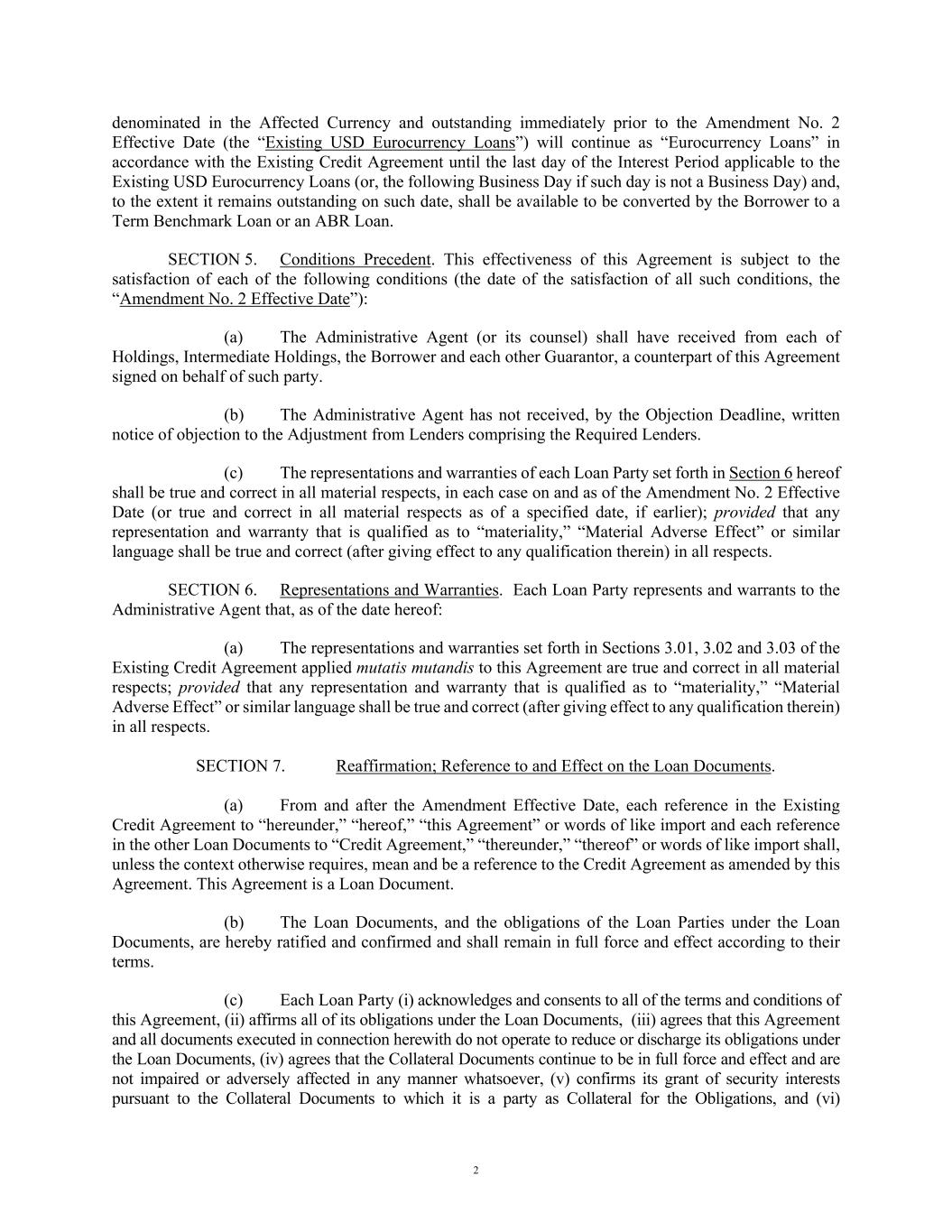 2 denominated in the Affected Currency and outstanding immediately prior to the Amendment No. 2 Effective Date (the “Existing USD Eurocurrency Loans”) will continue as “Eurocurrency Loans” in accordance with the Existing Credit Agreement until the last day of the Interest Period applicable to the Existing USD Eurocurrency Loans (or, the following Business Day if such day is not a Business Day) and, to the extent it remains outstanding on such date, shall be available to be converted by the Borrower to a Term Benchmark Loan or an ABR Loan. SECTION 5. Conditions Precedent. This effectiveness of this Agreement is subject to the satisfaction of each of the following conditions (the date of the satisfaction of all such conditions, the “Amendment No. 2 Effective Date”): (a) The Administrative Agent (or its counsel) shall have received from each of Holdings, Intermediate Holdings, the Borrower and each other Guarantor, a counterpart of this Agreement signed on behalf of such party. (b) The Administrative Agent has not received, by the Objection Deadline, written notice of objection to the Adjustment from Lenders comprising the Required Lenders. (c) The representations and warranties of each Loan Party set forth in Section 6 hereof shall be true and correct in all material respects, in each case on and as of the Amendment No. 2 Effective Date (or true and correct in all material respects as of a specified date, if earlier); provided that any representation and warranty that is qualified as to “materiality,” “Material Adverse Effect” or similar language shall be true and correct (after giving effect to any qualification therein) in all respects. SECTION 6. Representations and Warranties. Each Loan Party represents and warrants to the Administrative Agent that, as of the date hereof: (a) The representations and warranties set forth in Sections 3.01, 3.02 and 3.03 of the Existing Credit Agreement applied mutatis mutandis to this Agreement are true and correct in all material respects; provided that any representation and warranty that is qualified as to “materiality,” “Material Adverse Effect” or similar language shall be true and correct (after giving effect to any qualification therein) in all respects. SECTION 7. Reaffirmation; Reference to and Effect on the Loan Documents. (a) From and after the Amendment Effective Date, each reference in the Existing Credit Agreement to “hereunder,” “hereof,” “this Agreement” or words of like import and each reference in the other Loan Documents to “Credit Agreement,” “thereunder,” “thereof” or words of like import shall, unless the context otherwise requires, mean and be a reference to the Credit Agreement as amended by this Agreement. This Agreement is a Loan Document. (b) The Loan Documents, and the obligations of the Loan Parties under the Loan Documents, are hereby ratified and confirmed and shall remain in full force and effect according to their terms. (c) Each Loan Party (i) acknowledges and consents to all of the terms and conditions of this Agreement, (ii) affirms all of its obligations under the Loan Documents, (iii) agrees that this Agreement and all documents executed in connection herewith do not operate to reduce or discharge its obligations under the Loan Documents, (iv) agrees that the Collateral Documents continue to be in full force and effect and are not impaired or adversely affected in any manner whatsoever, (v) confirms its grant of security interests pursuant to the Collateral Documents to which it is a party as Collateral for the Obligations, and (vi)