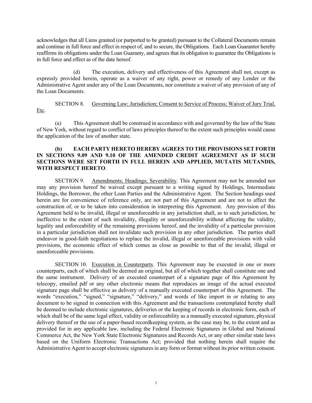 3 acknowledges that all Liens granted (or purported to be granted) pursuant to the Collateral Documents remain and continue in full force and effect in respect of, and to secure, the Obligations. Each Loan Guarantor hereby reaffirms its obligations under the Loan Guaranty, and agrees that its obligation to guarantee the Obligations is in full force and effect as of the date hereof. (d) The execution, delivery and effectiveness of this Agreement shall not, except as expressly provided herein, operate as a waiver of any right, power or remedy of any Lender or the Administrative Agent under any of the Loan Documents, nor constitute a waiver of any provision of any of the Loan Documents. SECTION 8. Governing Law; Jurisdiction; Consent to Service of Process; Waiver of Jury Trial, Etc. (a) This Agreement shall be construed in accordance with and governed by the law of the State of New York, without regard to conflict of laws principles thereof to the extent such principles would cause the application of the law of another state. (b) EACH PARTY HERETO HEREBY AGREES TO THE PROVISIONS SET FORTH IN SECTIONS 9.09 AND 9.10 OF THE AMENDED CREDIT AGREEMENT AS IF SUCH SECTIONS WERE SET FORTH IN FULL HEREIN AND APPLIED, MUTATIS MUTANDIS, WITH RESPECT HERETO. SECTION 9. Amendments; Headings; Severability. This Agreement may not be amended nor may any provision hereof be waived except pursuant to a writing signed by Holdings, Intermediate Holdings, the Borrower, the other Loan Parties and the Administrative Agent. The Section headings used herein are for convenience of reference only, are not part of this Agreement and are not to affect the construction of, or to be taken into consideration in interpreting this Agreement. Any provision of this Agreement held to be invalid, illegal or unenforceable in any jurisdiction shall, as to such jurisdiction, be ineffective to the extent of such invalidity, illegality or unenforceability without affecting the validity, legality and enforceability of the remaining provisions hereof, and the invalidity of a particular provision in a particular jurisdiction shall not invalidate such provision in any other jurisdiction. The parties shall endeavor in good-faith negotiations to replace the invalid, illegal or unenforceable provisions with valid provisions, the economic effect of which comes as close as possible to that of the invalid, illegal or unenforceable provisions. SECTION 10. Execution in Counterparts. This Agreement may be executed in one or more counterparts, each of which shall be deemed an original, but all of which together shall constitute one and the same instrument. Delivery of an executed counterpart of a signature page of this Agreement by telecopy, emailed pdf or any other electronic means that reproduces an image of the actual executed signature page shall be effective as delivery of a manually executed counterpart of this Agreement. The words “execution,” “signed,” “signature,” “delivery,” and words of like import in or relating to any document to be signed in connection with this Agreement and the transactions contemplated hereby shall be deemed to include electronic signatures, deliveries or the keeping of records in electronic form, each of which shall be of the same legal effect, validity or enforceability as a manually executed signature, physical delivery thereof or the use of a paper-based recordkeeping system, as the case may be, to the extent and as provided for in any applicable law, including the Federal Electronic Signatures in Global and National Commerce Act, the New York State Electronic Signatures and Records Act, or any other similar state laws based on the Uniform Electronic Transactions Act; provided that nothing herein shall require the Administrative Agent to accept electronic signatures in any form or format without its prior written consent.