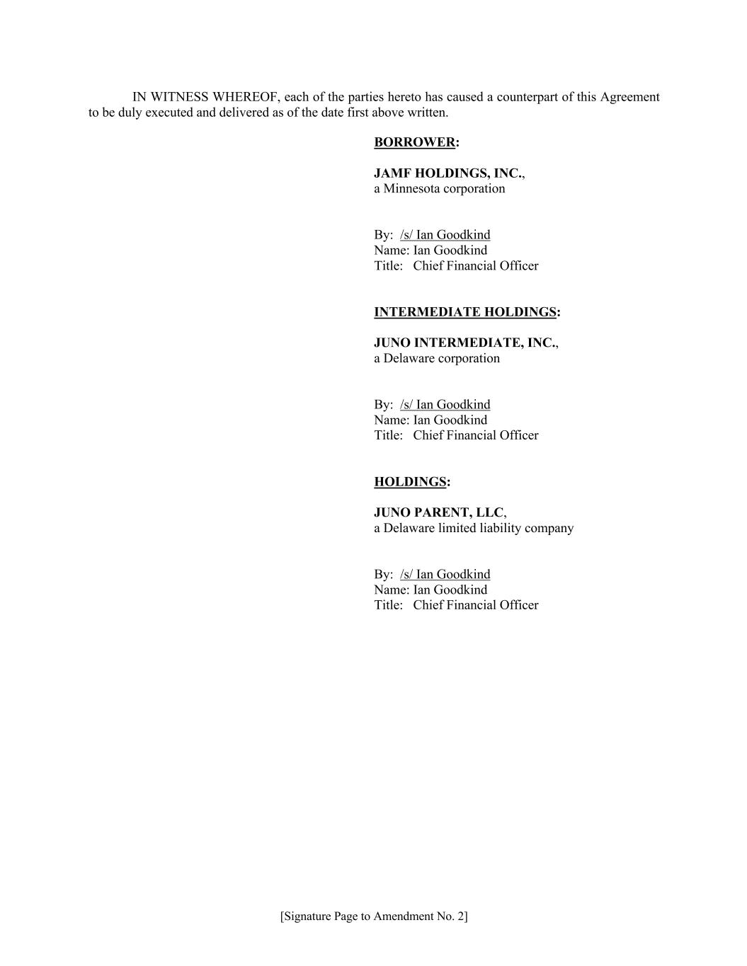 [Signature Page to Amendment No. 2] IN WITNESS WHEREOF, each of the parties hereto has caused a counterpart of this Agreement to be duly executed and delivered as of the date first above written. BORROWER: JAMF HOLDINGS, INC., a Minnesota corporation By: /s/ Ian Goodkind Name: Ian Goodkind Title: Chief Financial Officer INTERMEDIATE HOLDINGS: JUNO INTERMEDIATE, INC., a Delaware corporation By: /s/ Ian Goodkind Name: Ian Goodkind Title: Chief Financial Officer HOLDINGS: JUNO PARENT, LLC, a Delaware limited liability company By: /s/ Ian Goodkind Name: Ian Goodkind Title: Chief Financial Officer