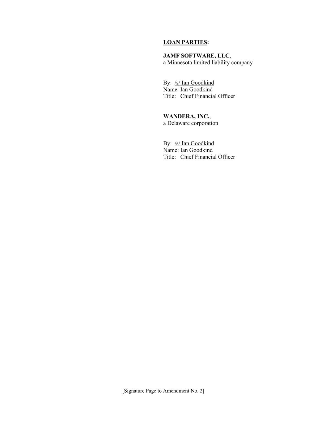 [Signature Page to Amendment No. 2] LOAN PARTIES: JAMF SOFTWARE, LLC, a Minnesota limited liability company By: /s/ Ian Goodkind Name: Ian Goodkind Title: Chief Financial Officer WANDERA, INC., a Delaware corporation By: /s/ Ian Goodkind Name: Ian Goodkind Title: Chief Financial Officer