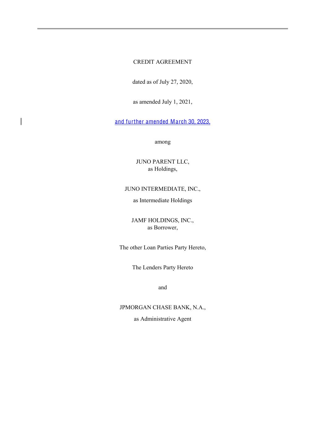 CREDIT AGREEMENT dated as of July 27, 2020, as amended July 1, 2021, and further amended March 30, 2023, among JUNO PARENT LLC, as Holdings, JUNO INTERMEDIATE, INC., as Intermediate Holdings JAMF HOLDINGS, INC., as Borrower, The other Loan Parties Party Hereto, The Lenders Party Hereto and JPMORGAN CHASE BANK, N.A., as Administrative Agent