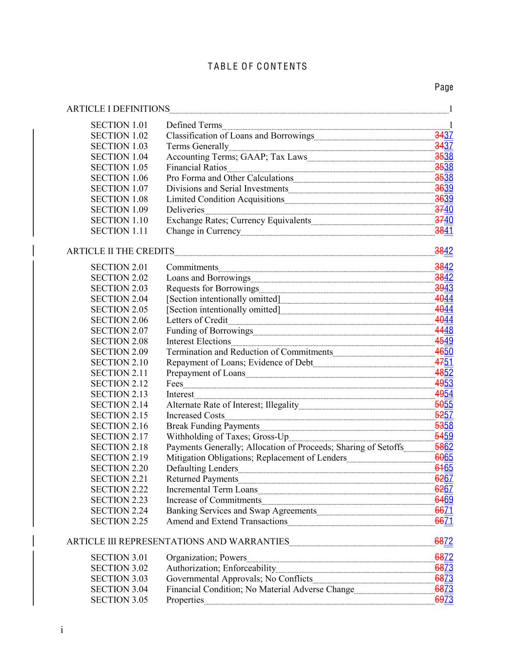 T A B L E O F C O N T E N TS Page ARTICLE I DEFINITIONS 1 SECTION 1.01 Defined Terms 1 SECTION 1.02 Classification of Loans and Borrowings 3437 SECTION 1.03 Terms Generally 3437 SECTION 1.04 Accounting Terms; GAAP; Tax Laws 3538 SECTION 1.05 Financial Ratios 3538 SECTION 1.06 Pro Forma and Other Calculations 3538 SECTION 1.07 Divisions and Serial Investments 3639 SECTION 1.08 Limited Condition Acquisitions 3639 SECTION 1.09 Deliveries 3740 SECTION 1.10 Exchange Rates; Currency Equivalents 3740 SECTION 1.11 Change in Currency 3841 ARTICLE II THE CREDITS 3842 SECTION 2.01 Commitments 3842 SECTION 2.02 Loans and Borrowings 3842 SECTION 2.03 Requests for Borrowings 3943 SECTION 2.04 [Section intentionally omitted] 4044 SECTION 2.05 [Section intentionally omitted] 4044 SECTION 2.06 Letters of Credit 4044 SECTION 2.07 Funding of Borrowings 4448 SECTION 2.08 Interest Elections 4549 SECTION 2.09 Termination and Reduction of Commitments 4650 SECTION 2.10 Repayment of Loans; Evidence of Debt 4751 SECTION 2.11 Prepayment of Loans 4852 SECTION 2.12 Fees 4953 SECTION 2.13 Interest 4954 SECTION 2.14 Alternate Rate of Interest; Illegality 5055 SECTION 2.15 Increased Costs 5257 SECTION 2.16 Break Funding Payments 5358 SECTION 2.17 Withholding of Taxes; Gross-Up 5459 SECTION 2.18 Payments Generally; Allocation of Proceeds; Sharing of Setoffs 5862 SECTION 2.19 Mitigation Obligations; Replacement of Lenders 6065 SECTION 2.20 Defaulting Lenders 6165 SECTION 2.21 Returned Payments 6267 SECTION 2.22 Incremental Term Loans 6267 SECTION 2.23 Increase of Commitments 6469 SECTION 2.24 Banking Services and Swap Agreements 6671 SECTION 2.25 Amend and Extend Transactions 6671 ARTICLE III REPRESENTATIONS AND WARRANTIES 6872 SECTION 3.01 Organization; Powers 6872 SECTION 3.02 Authorization; Enforceability 6873 SECTION 3.03 Governmental Approvals; No Conflicts 6873 SECTION 3.04 Financial Condition; No Material Adverse Change 6873 SECTION 3.05 Properties 6973 i