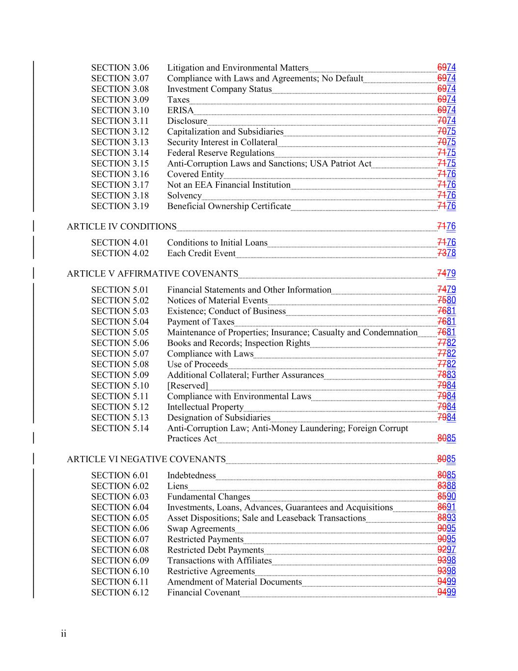 SECTION 3.06 Litigation and Environmental Matters 6974 SECTION 3.07 Compliance with Laws and Agreements; No Default 6974 SECTION 3.08 Investment Company Status 6974 SECTION 3.09 Taxes 6974 SECTION 3.10 ERISA 6974 SECTION 3.11 Disclosure 7074 SECTION 3.12 Capitalization and Subsidiaries 7075 SECTION 3.13 Security Interest in Collateral 7075 SECTION 3.14 Federal Reserve Regulations 7175 SECTION 3.15 Anti-Corruption Laws and Sanctions; USA Patriot Act 7175 SECTION 3.16 Covered Entity 7176 SECTION 3.17 Not an EEA Financial Institution 7176 SECTION 3.18 Solvency 7176 SECTION 3.19 Beneficial Ownership Certificate 7176 ARTICLE IV CONDITIONS 7176 SECTION 4.01 Conditions to Initial Loans 7176 SECTION 4.02 Each Credit Event 7378 ARTICLE V AFFIRMATIVE COVENANTS 7479 SECTION 5.01 Financial Statements and Other Information 7479 SECTION 5.02 Notices of Material Events 7580 SECTION 5.03 Existence; Conduct of Business 7681 SECTION 5.04 Payment of Taxes 7681 SECTION 5.05 Maintenance of Properties; Insurance; Casualty and Condemnation 7681 SECTION 5.06 Books and Records; Inspection Rights 7782 SECTION 5.07 Compliance with Laws 7782 SECTION 5.08 Use of Proceeds 7782 SECTION 5.09 Additional Collateral; Further Assurances 7883 SECTION 5.10 [Reserved] 7984 SECTION 5.11 Compliance with Environmental Laws 7984 SECTION 5.12 Intellectual Property 7984 SECTION 5.13 Designation of Subsidiaries 7984 SECTION 5.14 Anti-Corruption Law; Anti-Money Laundering; Foreign Corrupt Practices Act 8085 ARTICLE VI NEGATIVE COVENANTS 8085 SECTION 6.01 Indebtedness 8085 SECTION 6.02 Liens 8388 SECTION 6.03 Fundamental Changes 8590 SECTION 6.04 Investments, Loans, Advances, Guarantees and Acquisitions 8691 SECTION 6.05 Asset Dispositions; Sale and Leaseback Transactions 8893 SECTION 6.06 Swap Agreements 9095 SECTION 6.07 Restricted Payments 9095 SECTION 6.08 Restricted Debt Payments 9297 SECTION 6.09 Transactions with Affiliates 9398 SECTION 6.10 Restrictive Agreements 9398 SECTION 6.11 Amendment of Material Documents 9499 SECTION 6.12 Financial Covenant 9499 ii