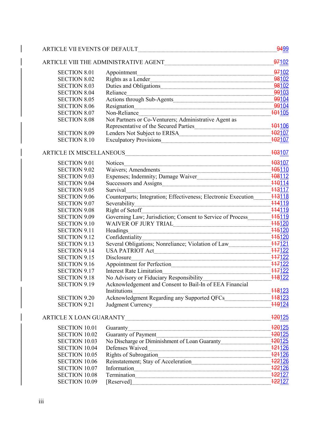 ARTICLE VII EVENTS OF DEFAULT 9499 ARTICLE VIII THE ADMINISTRATIVE AGENT 97102 SECTION 8.01 Appointment 97102 SECTION 8.02 Rights as a Lender 98102 SECTION 8.03 Duties and Obligations 98102 SECTION 8.04 Reliance 99103 SECTION 8.05 Actions through Sub-Agents 99104 SECTION 8.06 Resignation 99104 SECTION 8.07 Non-Reliance 101105 SECTION 8.08 Not Partners or Co-Venturers; Administrative Agent as Representative of the Secured Parties 101106 SECTION 8.09 Lenders Not Subject to ERISA 102107 SECTION 8.10 Exculpatory Provisions 102107 ARTICLE IX MISCELLANEOUS 103107 SECTION 9.01 Notices 103107 SECTION 9.02 Waivers; Amendments 105110 SECTION 9.03 Expenses; Indemnity; Damage Waiver 108112 SECTION 9.04 Successors and Assigns 110114 SECTION 9.05 Survival 113117 SECTION 9.06 Counterparts; Integration; Effectiveness; Electronic Execution 113118 SECTION 9.07 Severability 114119 SECTION 9.08 Right of Setoff 114119 SECTION 9.09 Governing Law; Jurisdiction; Consent to Service of Process 115119 SECTION 9.10 WAIVER OF JURY TRIAL 115120 SECTION 9.11 Headings 115120 SECTION 9.12 Confidentiality 115120 SECTION 9.13 Several Obligations; Nonreliance; Violation of Law 117121 SECTION 9.14 USA PATRIOT Act 117122 SECTION 9.15 Disclosure 117122 SECTION 9.16 Appointment for Perfection 117122 SECTION 9.17 Interest Rate Limitation 117122 SECTION 9.18 No Advisory or Fiduciary Responsibility 118122 SECTION 9.19 Acknowledgement and Consent to Bail-In of EEA Financial Institutions 118123 SECTION 9.20 Acknowledgment Regarding any Supported QFCs 118123 SECTION 9.21 Judgment Currency 119124 ARTICLE X LOAN GUARANTY 120125 SECTION 10.01 Guaranty 120125 SECTION 10.02 Guaranty of Payment 120125 SECTION 10.03 No Discharge or Diminishment of Loan Guaranty 120125 SECTION 10.04 Defenses Waived 121126 SECTION 10.05 Rights of Subrogation 121126 SECTION 10.06 Reinstatement; Stay of Acceleration 122126 SECTION 10.07 Information 122126 SECTION 10.08 Termination 122127 SECTION 10.09 [Reserved] 122127 iii