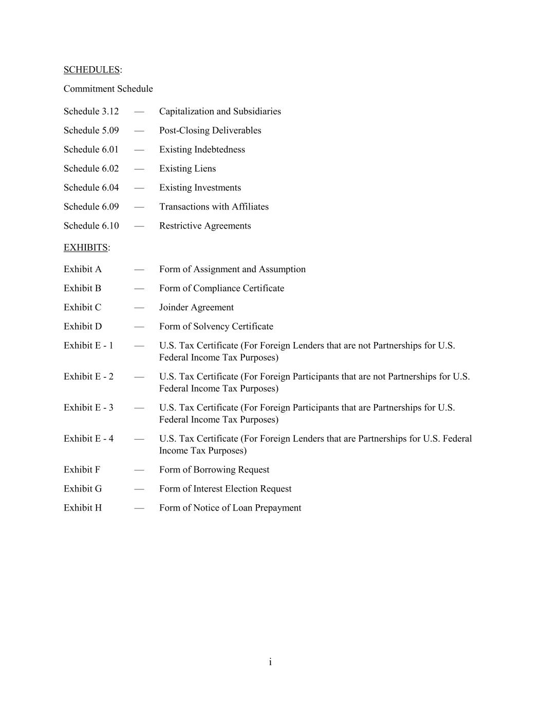 SCHEDULES: Commitment Schedule Schedule 3.12 — Capitalization and Subsidiaries Schedule 5.09 — Post-Closing Deliverables Schedule 6.01 — Existing Indebtedness Schedule 6.02 — Existing Liens Schedule 6.04 — Existing Investments Schedule 6.09 — Transactions with Affiliates Schedule 6.10 — Restrictive Agreements EXHIBITS: Exhibit A — Form of Assignment and Assumption Exhibit B — Form of Compliance Certificate Exhibit C — Joinder Agreement Exhibit D — Form of Solvency Certificate Exhibit E - 1 — U.S. Tax Certificate (For Foreign Lenders that are not Partnerships for U.S. Federal Income Tax Purposes) Exhibit E - 2 — U.S. Tax Certificate (For Foreign Participants that are not Partnerships for U.S. Federal Income Tax Purposes) Exhibit E - 3 — U.S. Tax Certificate (For Foreign Participants that are Partnerships for U.S. Federal Income Tax Purposes) Exhibit E - 4 — U.S. Tax Certificate (For Foreign Lenders that are Partnerships for U.S. Federal Income Tax Purposes) Exhibit F — Form of Borrowing Request Exhibit G — Form of Interest Election Request Exhibit H — Form of Notice of Loan Prepayment i