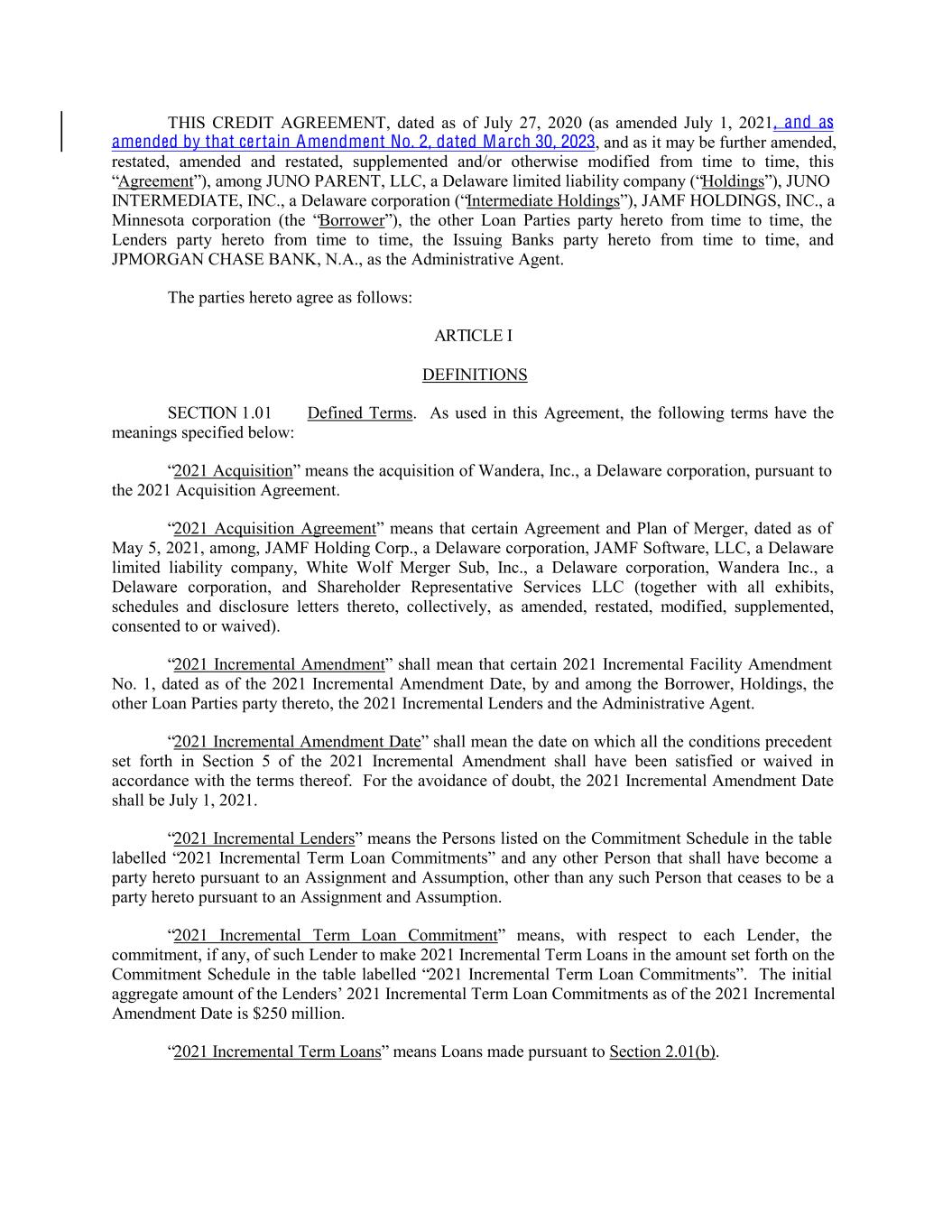 THIS CREDIT AGREEMENT, dated as of July 27, 2020 (as amended July 1, 2021, and as amended by that certain Amendment No. 2, dated March 30, 2023, and as it may be further amended, restated, amended and restated, supplemented and/or otherwise modified from time to time, this “Agreement”), among JUNO PARENT, LLC, a Delaware limited liability company (“Holdings”), JUNO INTERMEDIATE, INC., a Delaware corporation (“Intermediate Holdings”), JAMF HOLDINGS, INC., a Minnesota corporation (the “Borrower”), the other Loan Parties party hereto from time to time, the Lenders party hereto from time to time, the Issuing Banks party hereto from time to time, and JPMORGAN CHASE BANK, N.A., as the Administrative Agent. The parties hereto agree as follows: ARTICLE I DEFINITIONS SECTION 1.01 Defined Terms. As used in this Agreement, the following terms have the meanings specified below: “2021 Acquisition” means the acquisition of Wandera, Inc., a Delaware corporation, pursuant to the 2021 Acquisition Agreement. “2021 Acquisition Agreement” means that certain Agreement and Plan of Merger, dated as of May 5, 2021, among, JAMF Holding Corp., a Delaware corporation, JAMF Software, LLC, a Delaware limited liability company, White Wolf Merger Sub, Inc., a Delaware corporation, Wandera Inc., a Delaware corporation, and Shareholder Representative Services LLC (together with all exhibits, schedules and disclosure letters thereto, collectively, as amended, restated, modified, supplemented, consented to or waived). “2021 Incremental Amendment” shall mean that certain 2021 Incremental Facility Amendment No. 1, dated as of the 2021 Incremental Amendment Date, by and among the Borrower, Holdings, the other Loan Parties party thereto, the 2021 Incremental Lenders and the Administrative Agent. “2021 Incremental Amendment Date” shall mean the date on which all the conditions precedent set forth in Section 5 of the 2021 Incremental Amendment shall have been satisfied or waived in accordance with the terms thereof. For the avoidance of doubt, the 2021 Incremental Amendment Date shall be July 1, 2021. “2021 Incremental Lenders” means the Persons listed on the Commitment Schedule in the table labelled “2021 Incremental Term Loan Commitments” and any other Person that shall have become a party hereto pursuant to an Assignment and Assumption, other than any such Person that ceases to be a party hereto pursuant to an Assignment and Assumption. “2021 Incremental Term Loan Commitment” means, with respect to each Lender, the commitment, if any, of such Lender to make 2021 Incremental Term Loans in the amount set forth on the Commitment Schedule in the table labelled “2021 Incremental Term Loan Commitments”. The initial aggregate amount of the Lenders’ 2021 Incremental Term Loan Commitments as of the 2021 Incremental Amendment Date is $250 million. “2021 Incremental Term Loans” means Loans made pursuant to Section 2.01(b).