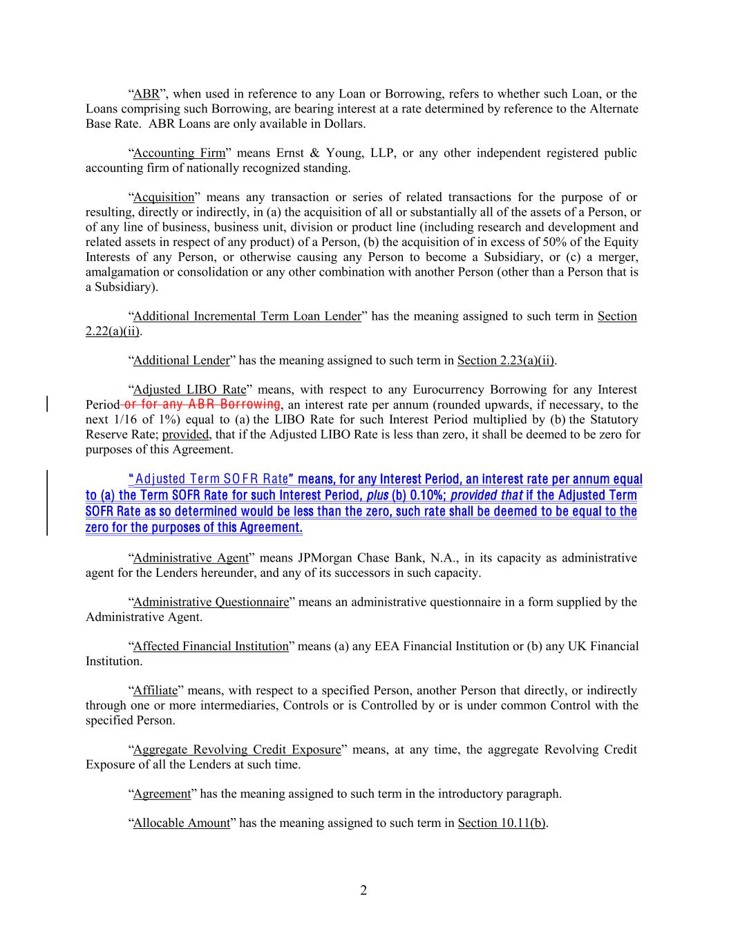 “ABR”, when used in reference to any Loan or Borrowing, refers to whether such Loan, or the Loans comprising such Borrowing, are bearing interest at a rate determined by reference to the Alternate Base Rate. ABR Loans are only available in Dollars. “Accounting Firm” means Ernst & Young, LLP, or any other independent registered public accounting firm of nationally recognized standing. “Acquisition” means any transaction or series of related transactions for the purpose of or resulting, directly or indirectly, in (a) the acquisition of all or substantially all of the assets of a Person, or of any line of business, business unit, division or product line (including research and development and related assets in respect of any product) of a Person, (b) the acquisition of in excess of 50% of the Equity Interests of any Person, or otherwise causing any Person to become a Subsidiary, or (c) a merger, amalgamation or consolidation or any other combination with another Person (other than a Person that is a Subsidiary). “Additional Incremental Term Loan Lender” has the meaning assigned to such term in Section 2.22(a)(ii). “Additional Lender” has the meaning assigned to such term in Section 2.23(a)(ii). “Adjusted LIBO Rate” means, with respect to any Eurocurrency Borrowing for any Interest Period or for any A BR Bor rowing, an interest rate per annum (rounded upwards, if necessary, to the next 1/16 of 1%) equal to (a) the LIBO Rate for such Interest Period multiplied by (b) the Statutory Reserve Rate; provided, that if the Adjusted LIBO Rate is less than zero, it shall be deemed to be zero for purposes of this Agreement. “ Adjusted Term SO F R Rate” means, for any Interest Period, an interest rate per annum equal to (a) the Term SOFR Rate for such Interest Period, plus (b) 0.10%; provided that if the Adjusted Term SOFR Rate as so determined would be less than the zero, such rate shall be deemed to be equal to the zero for the purposes of this Agreement. “Administrative Agent” means JPMorgan Chase Bank, N.A., in its capacity as administrative agent for the Lenders hereunder, and any of its successors in such capacity. “Administrative Questionnaire” means an administrative questionnaire in a form supplied by the Administrative Agent. “Affected Financial Institution” means (a) any EEA Financial Institution or (b) any UK Financial Institution. “Affiliate” means, with respect to a specified Person, another Person that directly, or indirectly through one or more intermediaries, Controls or is Controlled by or is under common Control with the specified Person. “Aggregate Revolving Credit Exposure” means, at any time, the aggregate Revolving Credit Exposure of all the Lenders at such time. “Agreement” has the meaning assigned to such term in the introductory paragraph. “Allocable Amount” has the meaning assigned to such term in Section 10.11(b). 2