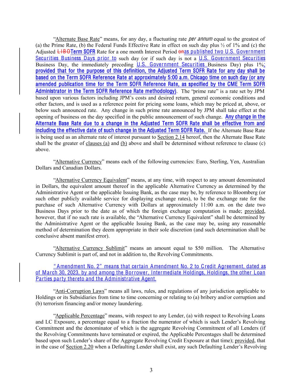 “Alternate Base Rate” means, for any day, a fluctuating rate per annum equal to the greatest of (a) the Prime Rate, (b) the Federal Funds Effective Rate in effect on such day plus ½ of 1% and (c) the Adjusted L IB OTerm SOFR Rate for a one month Interest Period onas published two U .S. Government Securities Business Days prior to such day (or if such day is not a U .S. Government Securities Business Day, the immediately preceding U .S. Government Securities Business Day) plus 1%; provided that for the purpose of this definition, the Adjusted Term SOFR Rate for any day shall be based on the Term SOFR Reference Rate at approximately 5:00 a.m. Chicago time on such day (or any amended publication time for the Term SOFR Reference Rate, as specified by the CME Term SOFR Administrator in the Term SOFR Reference Rate methodology). The “prime rate” is a rate set by JPM based upon various factors including JPM’s costs and desired return, general economic conditions and other factors, and is used as a reference point for pricing some loans, which may be priced at, above, or below such announced rate. Any change in such prime rate announced by JPM shall take effect at the opening of business on the day specified in the public announcement of such change. Any change in the Alternate Base Rate due to a change in the Adjusted Term SOFR Rate shall be effective from and including the effective date of such change in the Adjusted Term SOFR Rate. If the Alternate Base Rate is being used as an alternate rate of interest pursuant to Section 2.14 hereof, then the Alternate Base Rate shall be the greater of clauses (a) and (b) above and shall be determined without reference to clause (c) above. “Alternative Currency” means each of the following currencies: Euro, Sterling, Yen, Australian Dollars and Canadian Dollars. “Alternative Currency Equivalent” means, at any time, with respect to any amount denominated in Dollars, the equivalent amount thereof in the applicable Alternative Currency as determined by the Administrative Agent or the applicable Issuing Bank, as the case may be, by reference to Bloomberg (or such other publicly available service for displaying exchange rates), to be the exchange rate for the purchase of such Alternative Currency with Dollars at approximately 11:00 a.m. on the date two Business Days prior to the date as of which the foreign exchange computation is made; provided, however, that if no such rate is available, the “Alternative Currency Equivalent” shall be determined by the Administrative Agent or the applicable Issuing Bank, as the case may be, using any reasonable method of determination they deem appropriate in their sole discretion (and such determination shall be conclusive absent manifest error). “Alternative Currency Sublimit” means an amount equal to $50 million. The Alternative Currency Sublimit is part of, and not in addition to, the Revolving Commitments. “ Amendment No. 2” means that certain Amendment No. 2 to C redit Agreement, dated as of March 30, 2023, by and among the Bor rower , Intermediate Holdings, Holdings, the other Loan Parties party thereto and the Administrative Agent. “Anti-Corruption Laws” means all laws, rules, and regulations of any jurisdiction applicable to Holdings or its Subsidiaries from time to time concerning or relating to (a) bribery and/or corruption and (b) terrorism financing and/or money laundering. “Applicable Percentage” means, with respect to any Lender, (a) with respect to Revolving Loans and LC Exposure, a percentage equal to a fraction the numerator of which is such Lender’s Revolving Commitment and the denominator of which is the aggregate Revolving Commitment of all Lenders (if the Revolving Commitments have terminated or expired, the Applicable Percentages shall be determined based upon such Lender’s share of the Aggregate Revolving Credit Exposure at that time); provided, that in the case of Section 2.20 when a Defaulting Lender shall exist, any such Defaulting Lender’s Revolving 3