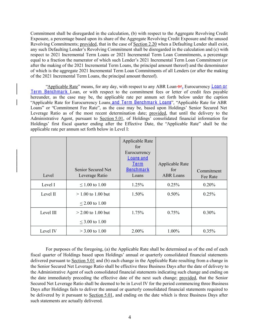 4 > 1.00 to 1.00 but < 2.00 to 1.00 Level 1.50% 0.50% 0.25% Level I Senior Secured Net Leverage Ratio Level III ≤ 1.00 to 1.00 > 2.00 to 1.00 but < 3.00 to 1.00 Commitment shall be disregarded in the calculation, (b) with respect to the Aggregate Revolving Credit Exposure, a percentage based upon its share of the Aggregate Revolving Credit Exposure and the unused Revolving Commitments; provided, that in the case of Section 2.20 when a Defaulting Lender shall exist, any such Defaulting Lender’s Revolving Commitment shall be disregarded in the calculation and (c) with respect to 2021 Incremental Term Loans or 2021 Incremental Term Loan Commitments, a percentage equal to a fraction the numerator of which such Lender’s 2021 Incremental Term Loan Commitment (or after the making of the 2021 Incremental Term Loans, the principal amount thereof) and the denominator of which is the aggregate 2021 Incremental Term Loan Commitments of all Lenders (or after the making of the 2021 Incremental Term Loans, the principal amount thereof). “Applicable Rate” means, for any day, with respect to any ABR Loan or , Eurocurrency Loan or Term Benchmark Loan, or with respect to the commitment fees or letter of credit fees payable hereunder, as the case may be, the applicable rate per annum set forth below under the caption “Applicable Rate for Eurocurrency Loans and Term Benchmark Loans”, “Applicable Rate for ABR Loans” or “Commitment Fee Rate”, as the case may be, based upon Holdings’ Senior Secured Net Leverage Ratio as of the most recent determination date; provided, that until the delivery to the Administrative Agent, pursuant to Section 5.01, of Holdings’ consolidated financial information for Holdings’ first fiscal quarter ending after the Effective Date, the “Applicable Rate” shall be the applicable rate per annum set forth below in Level I: 1.75% 1.25% 0.75% Applicable Rate for Eurocurrency Loans and Term Benchmark Loans 0.30% 0.25% Level IV 0.20% > 3.00 to 1.00 Applicable Rate for ABR Loans 2.00% 1.00% 0.35% Level II For purposes of the foregoing, (a) the Applicable Rate shall be determined as of the end of each fiscal quarter of Holdings based upon Holdings’ annual or quarterly consolidated financial statements delivered pursuant to Section 5.01 and (b) each change in the Applicable Rate resulting from a change in the Senior Secured Net Leverage Ratio shall be effective three Business Days after the date of delivery to the Administrative Agent of such consolidated financial statements indicating such change and ending on the date immediately preceding the effective date of the next such change; provided, that the Senior Secured Net Leverage Ratio shall be deemed to be in Level IV for the period commencing three Business Days after Holdings fails to deliver the annual or quarterly consolidated financial statements required to be delivered by it pursuant to Section 5.01, and ending on the date which is three Business Days after such statements are actually delivered. Commitment Fee Rate
