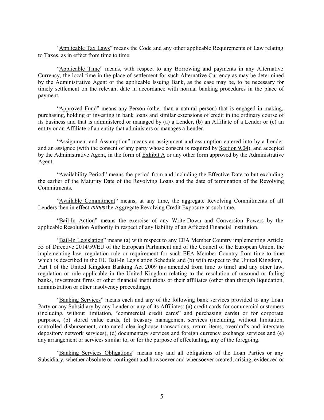 “Applicable Tax Laws” means the Code and any other applicable Requirements of Law relating to Taxes, as in effect from time to time. “Applicable Time” means, with respect to any Borrowing and payments in any Alternative Currency, the local time in the place of settlement for such Alternative Currency as may be determined by the Administrative Agent or the applicable Issuing Bank, as the case may be, to be necessary for timely settlement on the relevant date in accordance with normal banking procedures in the place of payment. “Approved Fund” means any Person (other than a natural person) that is engaged in making, purchasing, holding or investing in bank loans and similar extensions of credit in the ordinary course of its business and that is administered or managed by (a) a Lender, (b) an Affiliate of a Lender or (c) an entity or an Affiliate of an entity that administers or manages a Lender. “Assignment and Assumption” means an assignment and assumption entered into by a Lender and an assignee (with the consent of any party whose consent is required by Section 9.04), and accepted by the Administrative Agent, in the form of Exhibit A or any other form approved by the Administrative Agent. “Availability Period” means the period from and including the Effective Date to but excluding the earlier of the Maturity Date of the Revolving Loans and the date of termination of the Revolving Commitments. “Available Commitment” means, at any time, the aggregate Revolving Commitments of all Lenders then in effect minus the Aggregate Revolving Credit Exposure at such time. “Bail-In Action” means the exercise of any Write-Down and Conversion Powers by the applicable Resolution Authority in respect of any liability of an Affected Financial Institution. “Bail-In Legislation” means (a) with respect to any EEA Member Country implementing Article 55 of Directive 2014/59/EU of the European Parliament and of the Council of the European Union, the implementing law, regulation rule or requirement for such EEA Member Country from time to time which is described in the EU Bail-In Legislation Schedule and (b) with respect to the United Kingdom, Part I of the United Kingdom Banking Act 2009 (as amended from time to time) and any other law, regulation or rule applicable in the United Kingdom relating to the resolution of unsound or failing banks, investment firms or other financial institutions or their affiliates (other than through liquidation, administration or other insolvency proceedings). “Banking Services” means each and any of the following bank services provided to any Loan Party or any Subsidiary by any Lender or any of its Affiliates: (a) credit cards for commercial customers (including, without limitation, “commercial credit cards” and purchasing cards) or for corporate purposes, (b) stored value cards, (c) treasury management services (including, without limitation, controlled disbursement, automated clearinghouse transactions, return items, overdrafts and interstate depository network services), (d) documentary services and foreign currency exchange services and (e) any arrangement or services similar to, or for the purpose of effectuating, any of the foregoing. “Banking Services Obligations” means any and all obligations of the Loan Parties or any Subsidiary, whether absolute or contingent and howsoever and whensoever created, arising, evidenced or 5