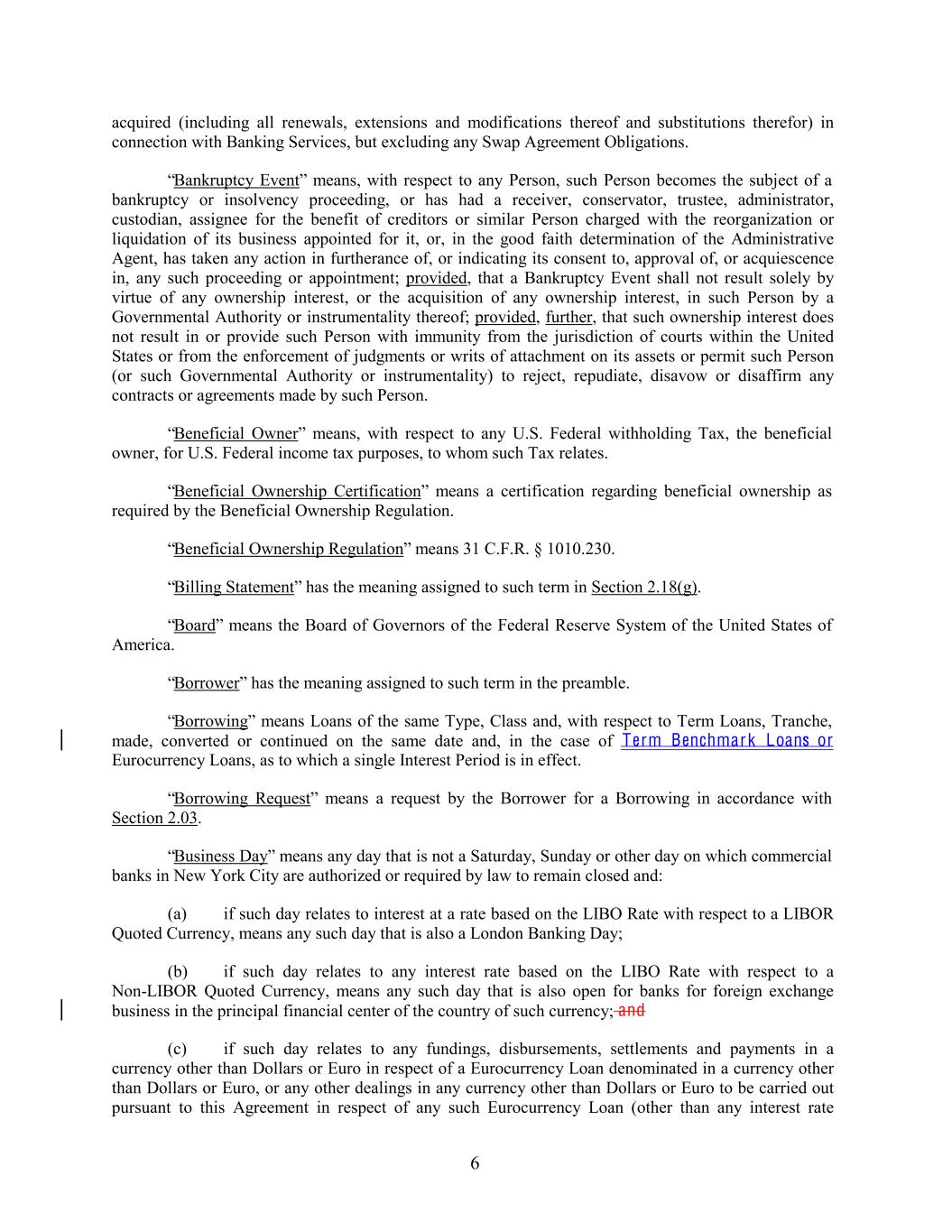 acquired (including all renewals, extensions and modifications thereof and substitutions therefor) in connection with Banking Services, but excluding any Swap Agreement Obligations. “Bankruptcy Event” means, with respect to any Person, such Person becomes the subject of a bankruptcy or insolvency proceeding, or has had a receiver, conservator, trustee, administrator, custodian, assignee for the benefit of creditors or similar Person charged with the reorganization or liquidation of its business appointed for it, or, in the good faith determination of the Administrative Agent, has taken any action in furtherance of, or indicating its consent to, approval of, or acquiescence in, any such proceeding or appointment; provided, that a Bankruptcy Event shall not result solely by virtue of any ownership interest, or the acquisition of any ownership interest, in such Person by a Governmental Authority or instrumentality thereof; provided, further, that such ownership interest does not result in or provide such Person with immunity from the jurisdiction of courts within the United States or from the enforcement of judgments or writs of attachment on its assets or permit such Person (or such Governmental Authority or instrumentality) to reject, repudiate, disavow or disaffirm any contracts or agreements made by such Person. “Beneficial Owner” means, with respect to any U.S. Federal withholding Tax, the beneficial owner, for U.S. Federal income tax purposes, to whom such Tax relates. “Beneficial Ownership Certification” means a certification regarding beneficial ownership as required by the Beneficial Ownership Regulation. “Beneficial Ownership Regulation” means 31 C.F.R. § 1010.230. “Billing Statement” has the meaning assigned to such term in Section 2.18(g). “Board” means the Board of Governors of the Federal Reserve System of the United States of America. “Borrower” has the meaning assigned to such term in the preamble. “Borrowing” means Loans of the same Type, Class and, with respect to Term Loans, Tranche, made, converted or continued on the same date and, in the case of Term Benchmark Loans or Eurocurrency Loans, as to which a single Interest Period is in effect. “Borrowing Request” means a request by the Borrower for a Borrowing in accordance with Section 2.03. “Business Day” means any day that is not a Saturday, Sunday or other day on which commercial banks in New York City are authorized or required by law to remain closed and: (a) if such day relates to interest at a rate based on the LIBO Rate with respect to a LIBOR Quoted Currency, means any such day that is also a London Banking Day; (b) if such day relates to any interest rate based on the LIBO Rate with respect to a Non-LIBOR Quoted Currency, means any such day that is also open for banks for foreign exchange business in the principal financial center of the country of such currency; and (c) if such day relates to any fundings, disbursements, settlements and payments in a currency other than Dollars or Euro in respect of a Eurocurrency Loan denominated in a currency other than Dollars or Euro, or any other dealings in any currency other than Dollars or Euro to be carried out pursuant to this Agreement in respect of any such Eurocurrency Loan (other than any interest rate 6