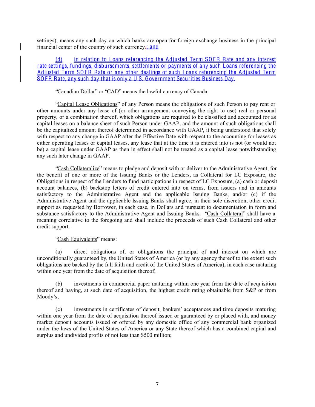 settings), means any such day on which banks are open for foreign exchange business in the principal financial center of the country of such currency.; and (d) in relation to Loans referencing the Adjusted Term SO F R Rate and any interest rate settings, fundings, disbursements, settlements or payments of any such Loans referencing the Adjusted Term SO F R Rate or any other dealings of such Loans referencing the Adjusted Term SO F R Rate, any such day that is only a U .S. Government Securities Business Day. “Canadian Dollar” or “CAD” means the lawful currency of Canada. “Capital Lease Obligations” of any Person means the obligations of such Person to pay rent or other amounts under any lease of (or other arrangement conveying the right to use) real or personal property, or a combination thereof, which obligations are required to be classified and accounted for as capital leases on a balance sheet of such Person under GAAP, and the amount of such obligations shall be the capitalized amount thereof determined in accordance with GAAP, it being understood that solely with respect to any change in GAAP after the Effective Date with respect to the accounting for leases as either operating leases or capital leases, any lease that at the time it is entered into is not (or would not be) a capital lease under GAAP as then in effect shall not be treated as a capital lease notwithstanding any such later change in GAAP. “Cash Collateralize” means to pledge and deposit with or deliver to the Administrative Agent, for the benefit of one or more of the Issuing Banks or the Lenders, as Collateral for LC Exposure, the Obligations in respect of the Lenders to fund participations in respect of LC Exposure, (a) cash or deposit account balances, (b) backstop letters of credit entered into on terms, from issuers and in amounts satisfactory to the Administrative Agent and the applicable Issuing Banks, and/or (c) if the Administrative Agent and the applicable Issuing Banks shall agree, in their sole discretion, other credit support as requested by Borrower, in each case, in Dollars and pursuant to documentation in form and substance satisfactory to the Administrative Agent and Issuing Banks. “Cash Collateral” shall have a meaning correlative to the foregoing and shall include the proceeds of such Cash Collateral and other credit support. “Cash Equivalents” means: (a) direct obligations of, or obligations the principal of and interest on which are unconditionally guaranteed by, the United States of America (or by any agency thereof to the extent such obligations are backed by the full faith and credit of the United States of America), in each case maturing within one year from the date of acquisition thereof; (b) investments in commercial paper maturing within one year from the date of acquisition thereof and having, at such date of acquisition, the highest credit rating obtainable from S&P or from Moody’s; (c) investments in certificates of deposit, bankers’ acceptances and time deposits maturing within one year from the date of acquisition thereof issued or guaranteed by or placed with, and money market deposit accounts issued or offered by any domestic office of any commercial bank organized under the laws of the United States of America or any State thereof which has a combined capital and surplus and undivided profits of not less than $500 million; 7