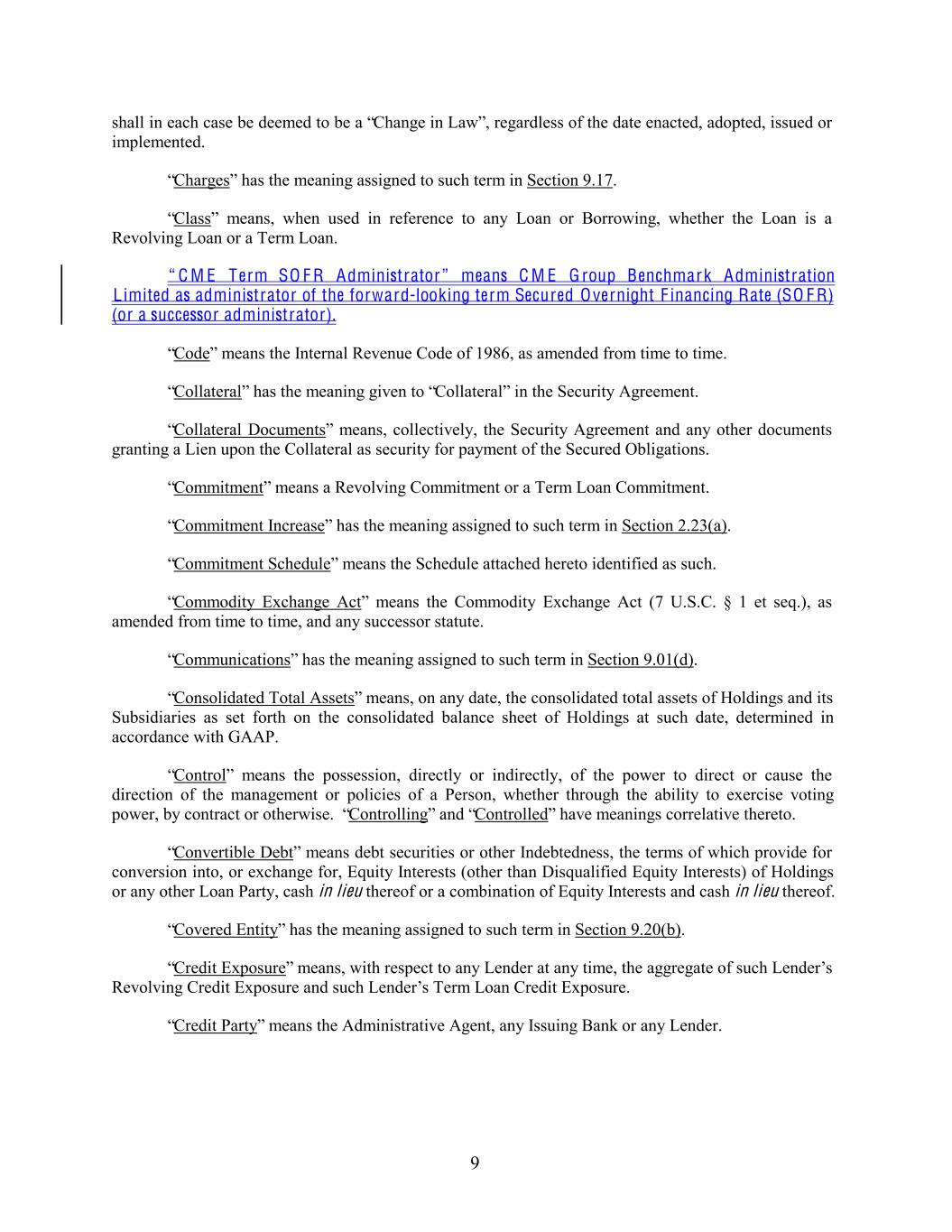 shall in each case be deemed to be a “Change in Law”, regardless of the date enacted, adopted, issued or implemented. “Charges” has the meaning assigned to such term in Section 9.17. “Class” means, when used in reference to any Loan or Borrowing, whether the Loan is a Revolving Loan or a Term Loan. “ C M E Term SO F R Administrator” means C M E G roup Benchmark Administration L imited as administrator of the forward-looking term Secured Overnight F inancing Rate (SO F R) (or a successor administrator). “Code” means the Internal Revenue Code of 1986, as amended from time to time. “Collateral” has the meaning given to “Collateral” in the Security Agreement. “Collateral Documents” means, collectively, the Security Agreement and any other documents granting a Lien upon the Collateral as security for payment of the Secured Obligations. “Commitment” means a Revolving Commitment or a Term Loan Commitment. “Commitment Increase” has the meaning assigned to such term in Section 2.23(a). “Commitment Schedule” means the Schedule attached hereto identified as such. “Commodity Exchange Act” means the Commodity Exchange Act (7 U.S.C. § 1 et seq.), as amended from time to time, and any successor statute. “Communications” has the meaning assigned to such term in Section 9.01(d). “Consolidated Total Assets” means, on any date, the consolidated total assets of Holdings and its Subsidiaries as set forth on the consolidated balance sheet of Holdings at such date, determined in accordance with GAAP. “Control” means the possession, directly or indirectly, of the power to direct or cause the direction of the management or policies of a Person, whether through the ability to exercise voting power, by contract or otherwise. “Controlling” and “Controlled” have meanings correlative thereto. “Convertible Debt” means debt securities or other Indebtedness, the terms of which provide for conversion into, or exchange for, Equity Interests (other than Disqualified Equity Interests) of Holdings or any other Loan Party, cash in lieu thereof or a combination of Equity Interests and cash in lieu thereof. “Covered Entity” has the meaning assigned to such term in Section 9.20(b). “Credit Exposure” means, with respect to any Lender at any time, the aggregate of such Lender’s Revolving Credit Exposure and such Lender’s Term Loan Credit Exposure. “Credit Party” means the Administrative Agent, any Issuing Bank or any Lender. 9