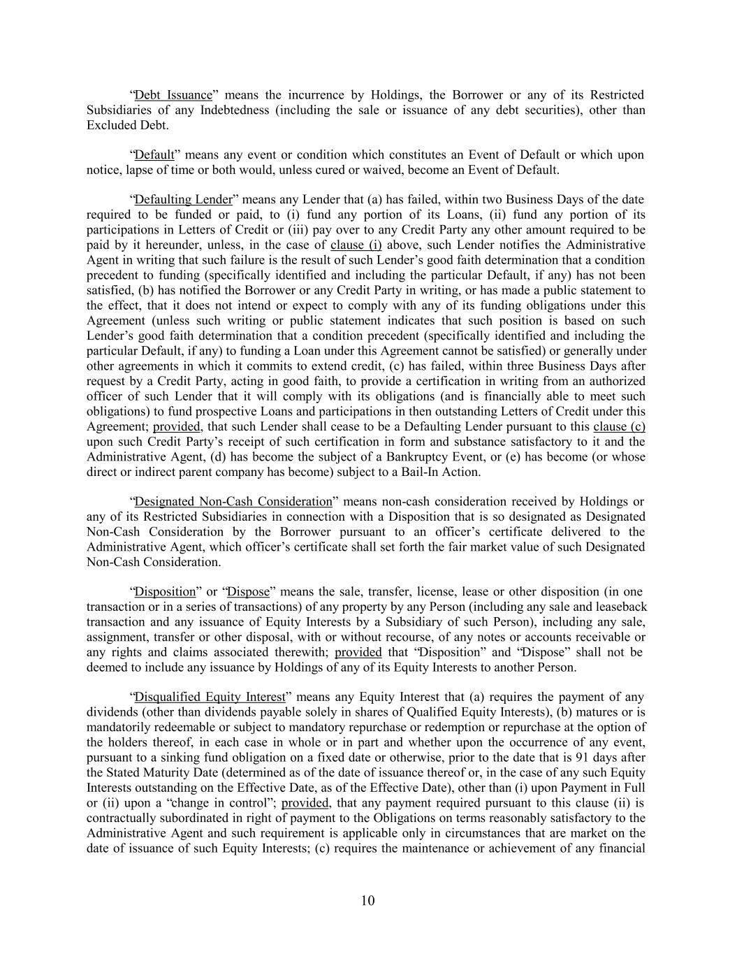 “Debt Issuance” means the incurrence by Holdings, the Borrower or any of its Restricted Subsidiaries of any Indebtedness (including the sale or issuance of any debt securities), other than Excluded Debt. “Default” means any event or condition which constitutes an Event of Default or which upon notice, lapse of time or both would, unless cured or waived, become an Event of Default. “Defaulting Lender” means any Lender that (a) has failed, within two Business Days of the date required to be funded or paid, to (i) fund any portion of its Loans, (ii) fund any portion of its participations in Letters of Credit or (iii) pay over to any Credit Party any other amount required to be paid by it hereunder, unless, in the case of clause (i) above, such Lender notifies the Administrative Agent in writing that such failure is the result of such Lender’s good faith determination that a condition precedent to funding (specifically identified and including the particular Default, if any) has not been satisfied, (b) has notified the Borrower or any Credit Party in writing, or has made a public statement to the effect, that it does not intend or expect to comply with any of its funding obligations under this Agreement (unless such writing or public statement indicates that such position is based on such Lender’s good faith determination that a condition precedent (specifically identified and including the particular Default, if any) to funding a Loan under this Agreement cannot be satisfied) or generally under other agreements in which it commits to extend credit, (c) has failed, within three Business Days after request by a Credit Party, acting in good faith, to provide a certification in writing from an authorized officer of such Lender that it will comply with its obligations (and is financially able to meet such obligations) to fund prospective Loans and participations in then outstanding Letters of Credit under this Agreement; provided, that such Lender shall cease to be a Defaulting Lender pursuant to this clause (c) upon such Credit Party’s receipt of such certification in form and substance satisfactory to it and the Administrative Agent, (d) has become the subject of a Bankruptcy Event, or (e) has become (or whose direct or indirect parent company has become) subject to a Bail-In Action. “Designated Non-Cash Consideration” means non-cash consideration received by Holdings or any of its Restricted Subsidiaries in connection with a Disposition that is so designated as Designated Non-Cash Consideration by the Borrower pursuant to an officer’s certificate delivered to the Administrative Agent, which officer’s certificate shall set forth the fair market value of such Designated Non-Cash Consideration. “Disposition” or “Dispose” means the sale, transfer, license, lease or other disposition (in one transaction or in a series of transactions) of any property by any Person (including any sale and leaseback transaction and any issuance of Equity Interests by a Subsidiary of such Person), including any sale, assignment, transfer or other disposal, with or without recourse, of any notes or accounts receivable or any rights and claims associated therewith; provided that “Disposition” and “Dispose” shall not be deemed to include any issuance by Holdings of any of its Equity Interests to another Person. “Disqualified Equity Interest” means any Equity Interest that (a) requires the payment of any dividends (other than dividends payable solely in shares of Qualified Equity Interests), (b) matures or is mandatorily redeemable or subject to mandatory repurchase or redemption or repurchase at the option of the holders thereof, in each case in whole or in part and whether upon the occurrence of any event, pursuant to a sinking fund obligation on a fixed date or otherwise, prior to the date that is 91 days after the Stated Maturity Date (determined as of the date of issuance thereof or, in the case of any such Equity Interests outstanding on the Effective Date, as of the Effective Date), other than (i) upon Payment in Full or (ii) upon a “change in control”; provided, that any payment required pursuant to this clause (ii) is contractually subordinated in right of payment to the Obligations on terms reasonably satisfactory to the Administrative Agent and such requirement is applicable only in circumstances that are market on the date of issuance of such Equity Interests; (c) requires the maintenance or achievement of any financial 10
