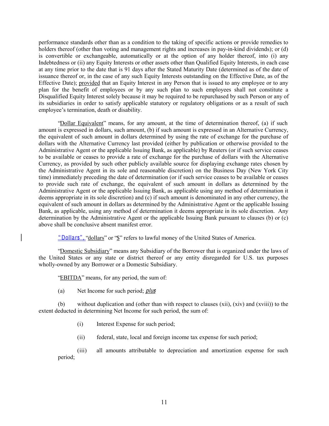 performance standards other than as a condition to the taking of specific actions or provide remedies to holders thereof (other than voting and management rights and increases in pay-in-kind dividends); or (d) is convertible or exchangeable, automatically or at the option of any holder thereof, into (i) any Indebtedness or (ii) any Equity Interests or other assets other than Qualified Equity Interests, in each case at any time prior to the date that is 91 days after the Stated Maturity Date (determined as of the date of issuance thereof or, in the case of any such Equity Interests outstanding on the Effective Date, as of the Effective Date); provided that an Equity Interest in any Person that is issued to any employee or to any plan for the benefit of employees or by any such plan to such employees shall not constitute a Disqualified Equity Interest solely because it may be required to be repurchased by such Person or any of its subsidiaries in order to satisfy applicable statutory or regulatory obligations or as a result of such employee’s termination, death or disability. “Dollar Equivalent” means, for any amount, at the time of determination thereof, (a) if such amount is expressed in dollars, such amount, (b) if such amount is expressed in an Alternative Currency, the equivalent of such amount in dollars determined by using the rate of exchange for the purchase of dollars with the Alternative Currency last provided (either by publication or otherwise provided to the Administrative Agent or the applicable Issuing Bank, as applicable) by Reuters (or if such service ceases to be available or ceases to provide a rate of exchange for the purchase of dollars with the Alternative Currency, as provided by such other publicly available source for displaying exchange rates chosen by the Administrative Agent in its sole and reasonable discretion) on the Business Day (New York City time) immediately preceding the date of determination (or if such service ceases to be available or ceases to provide such rate of exchange, the equivalent of such amount in dollars as determined by the Administrative Agent or the applicable Issuing Bank, as applicable using any method of determination it deems appropriate in its sole discretion) and (c) if such amount is denominated in any other currency, the equivalent of such amount in dollars as determined by the Administrative Agent or the applicable Issuing Bank, as applicable, using any method of determination it deems appropriate in its sole discretion. Any determination by the Administrative Agent or the applicable Issuing Bank pursuant to clauses (b) or (c) above shall be conclusive absent manifest error. “ Dollars” , “dollars” or “$” refers to lawful money of the United States of America. “Domestic Subsidiary” means any Subsidiary of the Borrower that is organized under the laws of the United States or any state or district thereof or any entity disregarded for U.S. tax purposes wholly-owned by any Borrower or a Domestic Subsidiary. “EBITDA” means, for any period, the sum of: (a) Net Income for such period; plus (b) without duplication and (other than with respect to clauses (xii), (xiv) and (xviii)) to the extent deducted in determining Net Income for such period, the sum of: (i) Interest Expense for such period; (ii) federal, state, local and foreign income tax expense for such period; (iii) all amounts attributable to depreciation and amortization expense for such period; 11