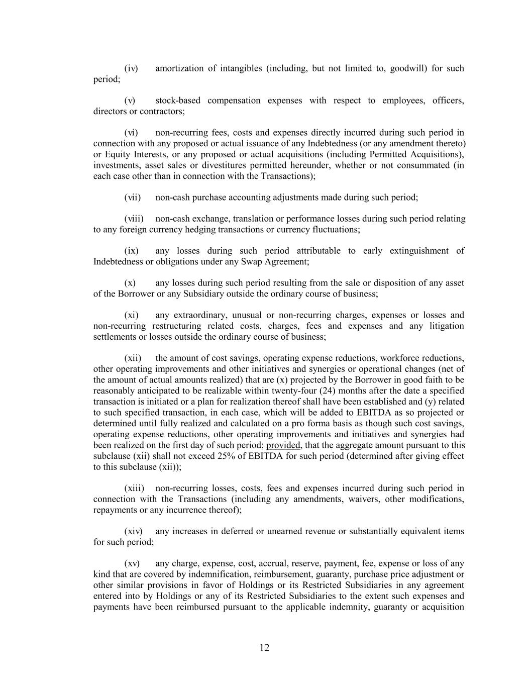 (iv) amortization of intangibles (including, but not limited to, goodwill) for such period; (v) stock-based compensation expenses with respect to employees, officers, directors or contractors; (vi) non-recurring fees, costs and expenses directly incurred during such period in connection with any proposed or actual issuance of any Indebtedness (or any amendment thereto) or Equity Interests, or any proposed or actual acquisitions (including Permitted Acquisitions), investments, asset sales or divestitures permitted hereunder, whether or not consummated (in each case other than in connection with the Transactions); (vii) non-cash purchase accounting adjustments made during such period; (viii) non-cash exchange, translation or performance losses during such period relating to any foreign currency hedging transactions or currency fluctuations; (ix) any losses during such period attributable to early extinguishment of Indebtedness or obligations under any Swap Agreement; (x) any losses during such period resulting from the sale or disposition of any asset of the Borrower or any Subsidiary outside the ordinary course of business; (xi) any extraordinary, unusual or non-recurring charges, expenses or losses and non-recurring restructuring related costs, charges, fees and expenses and any litigation settlements or losses outside the ordinary course of business; (xii) the amount of cost savings, operating expense reductions, workforce reductions, other operating improvements and other initiatives and synergies or operational changes (net of the amount of actual amounts realized) that are (x) projected by the Borrower in good faith to be reasonably anticipated to be realizable within twenty-four (24) months after the date a specified transaction is initiated or a plan for realization thereof shall have been established and (y) related to such specified transaction, in each case, which will be added to EBITDA as so projected or determined until fully realized and calculated on a pro forma basis as though such cost savings, operating expense reductions, other operating improvements and initiatives and synergies had been realized on the first day of such period; provided, that the aggregate amount pursuant to this subclause (xii) shall not exceed 25% of EBITDA for such period (determined after giving effect to this subclause (xii)); (xiii) non-recurring losses, costs, fees and expenses incurred during such period in connection with the Transactions (including any amendments, waivers, other modifications, repayments or any incurrence thereof); (xiv) any increases in deferred or unearned revenue or substantially equivalent items for such period; (xv) any charge, expense, cost, accrual, reserve, payment, fee, expense or loss of any kind that are covered by indemnification, reimbursement, guaranty, purchase price adjustment or other similar provisions in favor of Holdings or its Restricted Subsidiaries in any agreement entered into by Holdings or any of its Restricted Subsidiaries to the extent such expenses and payments have been reimbursed pursuant to the applicable indemnity, guaranty or acquisition 12