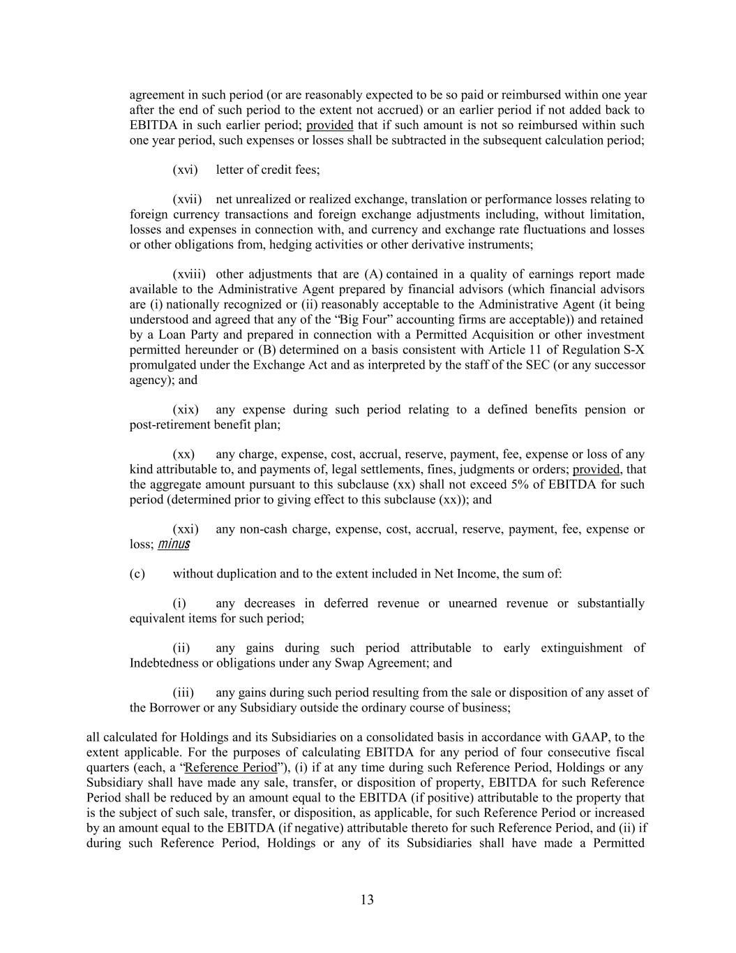 agreement in such period (or are reasonably expected to be so paid or reimbursed within one year after the end of such period to the extent not accrued) or an earlier period if not added back to EBITDA in such earlier period; provided that if such amount is not so reimbursed within such one year period, such expenses or losses shall be subtracted in the subsequent calculation period; (xvi) letter of credit fees; (xvii) net unrealized or realized exchange, translation or performance losses relating to foreign currency transactions and foreign exchange adjustments including, without limitation, losses and expenses in connection with, and currency and exchange rate fluctuations and losses or other obligations from, hedging activities or other derivative instruments; (xviii) other adjustments that are (A) contained in a quality of earnings report made available to the Administrative Agent prepared by financial advisors (which financial advisors are (i) nationally recognized or (ii) reasonably acceptable to the Administrative Agent (it being understood and agreed that any of the “Big Four” accounting firms are acceptable)) and retained by a Loan Party and prepared in connection with a Permitted Acquisition or other investment permitted hereunder or (B) determined on a basis consistent with Article 11 of Regulation S-X promulgated under the Exchange Act and as interpreted by the staff of the SEC (or any successor agency); and (xix) any expense during such period relating to a defined benefits pension or post-retirement benefit plan; (xx) any charge, expense, cost, accrual, reserve, payment, fee, expense or loss of any kind attributable to, and payments of, legal settlements, fines, judgments or orders; provided, that the aggregate amount pursuant to this subclause (xx) shall not exceed 5% of EBITDA for such period (determined prior to giving effect to this subclause (xx)); and (xxi) any non-cash charge, expense, cost, accrual, reserve, payment, fee, expense or loss; minus (c) without duplication and to the extent included in Net Income, the sum of: (i) any decreases in deferred revenue or unearned revenue or substantially equivalent items for such period; (ii) any gains during such period attributable to early extinguishment of Indebtedness or obligations under any Swap Agreement; and (iii) any gains during such period resulting from the sale or disposition of any asset of the Borrower or any Subsidiary outside the ordinary course of business; all calculated for Holdings and its Subsidiaries on a consolidated basis in accordance with GAAP, to the extent applicable. For the purposes of calculating EBITDA for any period of four consecutive fiscal quarters (each, a “Reference Period”), (i) if at any time during such Reference Period, Holdings or any Subsidiary shall have made any sale, transfer, or disposition of property, EBITDA for such Reference Period shall be reduced by an amount equal to the EBITDA (if positive) attributable to the property that is the subject of such sale, transfer, or disposition, as applicable, for such Reference Period or increased by an amount equal to the EBITDA (if negative) attributable thereto for such Reference Period, and (ii) if during such Reference Period, Holdings or any of its Subsidiaries shall have made a Permitted 13