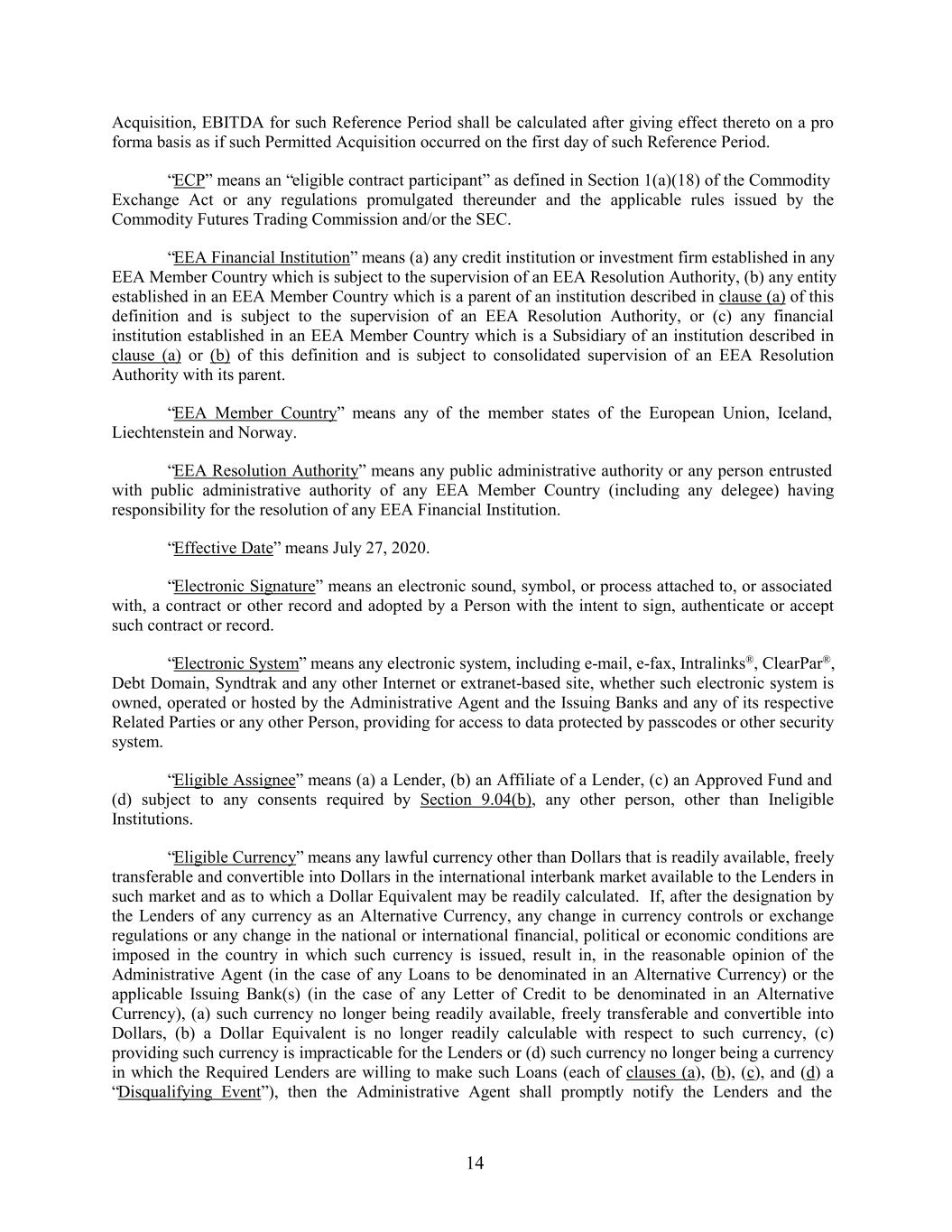 Acquisition, EBITDA for such Reference Period shall be calculated after giving effect thereto on a pro forma basis as if such Permitted Acquisition occurred on the first day of such Reference Period. “ECP” means an “eligible contract participant” as defined in Section 1(a)(18) of the Commodity Exchange Act or any regulations promulgated thereunder and the applicable rules issued by the Commodity Futures Trading Commission and/or the SEC. “EEA Financial Institution” means (a) any credit institution or investment firm established in any EEA Member Country which is subject to the supervision of an EEA Resolution Authority, (b) any entity established in an EEA Member Country which is a parent of an institution described in clause (a) of this definition and is subject to the supervision of an EEA Resolution Authority, or (c) any financial institution established in an EEA Member Country which is a Subsidiary of an institution described in clause (a) or (b) of this definition and is subject to consolidated supervision of an EEA Resolution Authority with its parent. “EEA Member Country” means any of the member states of the European Union, Iceland, Liechtenstein and Norway. “EEA Resolution Authority” means any public administrative authority or any person entrusted with public administrative authority of any EEA Member Country (including any delegee) having responsibility for the resolution of any EEA Financial Institution. “Effective Date” means July 27, 2020. “Electronic Signature” means an electronic sound, symbol, or process attached to, or associated with, a contract or other record and adopted by a Person with the intent to sign, authenticate or accept such contract or record. “Electronic System” means any electronic system, including e-mail, e-fax, Intralinks®, ClearPar®, Debt Domain, Syndtrak and any other Internet or extranet-based site, whether such electronic system is owned, operated or hosted by the Administrative Agent and the Issuing Banks and any of its respective Related Parties or any other Person, providing for access to data protected by passcodes or other security system. “Eligible Assignee” means (a) a Lender, (b) an Affiliate of a Lender, (c) an Approved Fund and (d) subject to any consents required by Section 9.04(b), any other person, other than Ineligible Institutions. “Eligible Currency” means any lawful currency other than Dollars that is readily available, freely transferable and convertible into Dollars in the international interbank market available to the Lenders in such market and as to which a Dollar Equivalent may be readily calculated. If, after the designation by the Lenders of any currency as an Alternative Currency, any change in currency controls or exchange regulations or any change in the national or international financial, political or economic conditions are imposed in the country in which such currency is issued, result in, in the reasonable opinion of the Administrative Agent (in the case of any Loans to be denominated in an Alternative Currency) or the applicable Issuing Bank(s) (in the case of any Letter of Credit to be denominated in an Alternative Currency), (a) such currency no longer being readily available, freely transferable and convertible into Dollars, (b) a Dollar Equivalent is no longer readily calculable with respect to such currency, (c) providing such currency is impracticable for the Lenders or (d) such currency no longer being a currency in which the Required Lenders are willing to make such Loans (each of clauses (a), (b), (c), and (d) a “Disqualifying Event”), then the Administrative Agent shall promptly notify the Lenders and the 14
