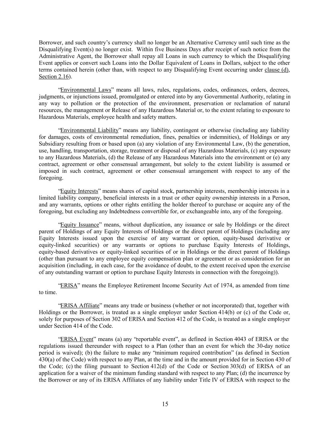 Borrower, and such country’s currency shall no longer be an Alternative Currency until such time as the Disqualifying Event(s) no longer exist. Within five Business Days after receipt of such notice from the Administrative Agent, the Borrower shall repay all Loans in such currency to which the Disqualifying Event applies or convert such Loans into the Dollar Equivalent of Loans in Dollars, subject to the other terms contained herein (other than, with respect to any Disqualifying Event occurring under clause (d), Section 2.16). “Environmental Laws” means all laws, rules, regulations, codes, ordinances, orders, decrees, judgments, or injunctions issued, promulgated or entered into by any Governmental Authority, relating in any way to pollution or the protection of the environment, preservation or reclamation of natural resources, the management or Release of any Hazardous Material or, to the extent relating to exposure to Hazardous Materials, employee health and safety matters. “Environmental Liability” means any liability, contingent or otherwise (including any liability for damages, costs of environmental remediation, fines, penalties or indemnities), of Holdings or any Subsidiary resulting from or based upon (a) any violation of any Environmental Law, (b) the generation, use, handling, transportation, storage, treatment or disposal of any Hazardous Materials, (c) any exposure to any Hazardous Materials, (d) the Release of any Hazardous Materials into the environment or (e) any contract, agreement or other consensual arrangement, but solely to the extent liability is assumed or imposed in such contract, agreement or other consensual arrangement with respect to any of the foregoing. “Equity Interests” means shares of capital stock, partnership interests, membership interests in a limited liability company, beneficial interests in a trust or other equity ownership interests in a Person, and any warrants, options or other rights entitling the holder thereof to purchase or acquire any of the foregoing, but excluding any Indebtedness convertible for, or exchangeable into, any of the foregoing. “Equity Issuance” means, without duplication, any issuance or sale by Holdings or the direct parent of Holdings of any Equity Interests of Holdings or the direct parent of Holdings (including any Equity Interests issued upon the exercise of any warrant or option, equity-based derivative or equity-linked securities) or any warrants or options to purchase Equity Interests of Holdings, equity-based derivatives or equity-linked securities of or in Holdings or the direct parent of Holdings (other than pursuant to any employee equity compensation plan or agreement or as consideration for an acquisition (including, in each case, for the avoidance of doubt, to the extent received upon the exercise of any outstanding warrant or option to purchase Equity Interests in connection with the foregoing)). “ERISA” means the Employee Retirement Income Security Act of 1974, as amended from time to time. “ERISA Affiliate” means any trade or business (whether or not incorporated) that, together with Holdings or the Borrower, is treated as a single employer under Section 414(b) or (c) of the Code or, solely for purposes of Section 302 of ERISA and Section 412 of the Code, is treated as a single employer under Section 414 of the Code. “ERISA Event” means (a) any “reportable event”, as defined in Section 4043 of ERISA or the regulations issued thereunder with respect to a Plan (other than an event for which the 30-day notice period is waived); (b) the failure to make any “minimum required contribution” (as defined in Section 430(a) of the Code) with respect to any Plan, at the time and in the amount provided for in Section 430 of the Code; (c) the filing pursuant to Section 412(d) of the Code or Section 303(d) of ERISA of an application for a waiver of the minimum funding standard with respect to any Plan; (d) the incurrence by the Borrower or any of its ERISA Affiliates of any liability under Title IV of ERISA with respect to the 15