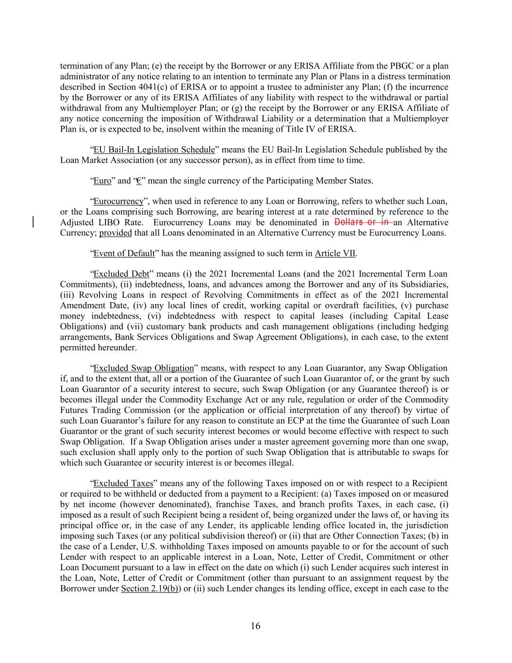 termination of any Plan; (e) the receipt by the Borrower or any ERISA Affiliate from the PBGC or a plan administrator of any notice relating to an intention to terminate any Plan or Plans in a distress termination described in Section 4041(c) of ERISA or to appoint a trustee to administer any Plan; (f) the incurrence by the Borrower or any of its ERISA Affiliates of any liability with respect to the withdrawal or partial withdrawal from any Multiemployer Plan; or (g) the receipt by the Borrower or any ERISA Affiliate of any notice concerning the imposition of Withdrawal Liability or a determination that a Multiemployer Plan is, or is expected to be, insolvent within the meaning of Title IV of ERISA. “EU Bail-In Legislation Schedule” means the EU Bail-In Legislation Schedule published by the Loan Market Association (or any successor person), as in effect from time to time. “Euro” and “€” mean the single currency of the Participating Member States. “Eurocurrency”, when used in reference to any Loan or Borrowing, refers to whether such Loan, or the Loans comprising such Borrowing, are bearing interest at a rate determined by reference to the Adjusted LIBO Rate. Eurocurrency Loans may be denominated in Dollars or in an Alternative Currency; provided that all Loans denominated in an Alternative Currency must be Eurocurrency Loans. “Event of Default” has the meaning assigned to such term in Article VII. “Excluded Debt” means (i) the 2021 Incremental Loans (and the 2021 Incremental Term Loan Commitments), (ii) indebtedness, loans, and advances among the Borrower and any of its Subsidiaries, (iii) Revolving Loans in respect of Revolving Commitments in effect as of the 2021 Incremental Amendment Date, (iv) any local lines of credit, working capital or overdraft facilities, (v) purchase money indebtedness, (vi) indebtedness with respect to capital leases (including Capital Lease Obligations) and (vii) customary bank products and cash management obligations (including hedging arrangements, Bank Services Obligations and Swap Agreement Obligations), in each case, to the extent permitted hereunder. “Excluded Swap Obligation” means, with respect to any Loan Guarantor, any Swap Obligation if, and to the extent that, all or a portion of the Guarantee of such Loan Guarantor of, or the grant by such Loan Guarantor of a security interest to secure, such Swap Obligation (or any Guarantee thereof) is or becomes illegal under the Commodity Exchange Act or any rule, regulation or order of the Commodity Futures Trading Commission (or the application or official interpretation of any thereof) by virtue of such Loan Guarantor’s failure for any reason to constitute an ECP at the time the Guarantee of such Loan Guarantor or the grant of such security interest becomes or would become effective with respect to such Swap Obligation. If a Swap Obligation arises under a master agreement governing more than one swap, such exclusion shall apply only to the portion of such Swap Obligation that is attributable to swaps for which such Guarantee or security interest is or becomes illegal. “Excluded Taxes” means any of the following Taxes imposed on or with respect to a Recipient or required to be withheld or deducted from a payment to a Recipient: (a) Taxes imposed on or measured by net income (however denominated), franchise Taxes, and branch profits Taxes, in each case, (i) imposed as a result of such Recipient being a resident of, being organized under the laws of, or having its principal office or, in the case of any Lender, its applicable lending office located in, the jurisdiction imposing such Taxes (or any political subdivision thereof) or (ii) that are Other Connection Taxes; (b) in the case of a Lender, U.S. withholding Taxes imposed on amounts payable to or for the account of such Lender with respect to an applicable interest in a Loan, Note, Letter of Credit, Commitment or other Loan Document pursuant to a law in effect on the date on which (i) such Lender acquires such interest in the Loan, Note, Letter of Credit or Commitment (other than pursuant to an assignment request by the Borrower under Section 2.19(b)) or (ii) such Lender changes its lending office, except in each case to the 16