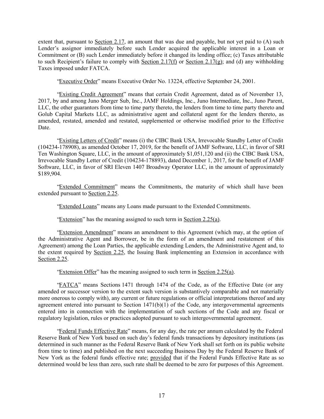 extent that, pursuant to Section 2.17, an amount that was due and payable, but not yet paid to (A) such Lender’s assignor immediately before such Lender acquired the applicable interest in a Loan or Commitment or (B) such Lender immediately before it changed its lending office; (c) Taxes attributable to such Recipient’s failure to comply with Section 2.17(f) or Section 2.17(g); and (d) any withholding Taxes imposed under FATCA. “Executive Order” means Executive Order No. 13224, effective September 24, 2001. “Existing Credit Agreement” means that certain Credit Agreement, dated as of November 13, 2017, by and among Juno Merger Sub, Inc., JAMF Holdings, Inc., Juno Intermediate, Inc., Juno Parent, LLC, the other guarantors from time to time party thereto, the lenders from time to time party thereto and Golub Capital Markets LLC, as administrative agent and collateral agent for the lenders thereto, as amended, restated, amended and restated, supplemented or otherwise modified prior to the Effective Date. “Existing Letters of Credit” means (i) the CIBC Bank USA, Irrevocable Standby Letter of Credit (104234-178908), as amended October 17, 2019, for the benefit of JAMF Software, LLC, in favor of SRI Ten Washington Square, LLC, in the amount of approximately $1,051,120 and (ii) the CIBC Bank USA, Irrevocable Standby Letter of Credit (104234-178893), dated December 1, 2017, for the benefit of JAMF Software, LLC, in favor of SRI Eleven 1407 Broadway Operator LLC, in the amount of approximately $189,904. “Extended Commitment” means the Commitments, the maturity of which shall have been extended pursuant to Section 2.25. “Extended Loans” means any Loans made pursuant to the Extended Commitments. “Extension” has the meaning assigned to such term in Section 2.25(a). “Extension Amendment” means an amendment to this Agreement (which may, at the option of the Administrative Agent and Borrower, be in the form of an amendment and restatement of this Agreement) among the Loan Parties, the applicable extending Lenders, the Administrative Agent and, to the extent required by Section 2.25, the Issuing Bank implementing an Extension in accordance with Section 2.25. “Extension Offer” has the meaning assigned to such term in Section 2.25(a). “FATCA” means Sections 1471 through 1474 of the Code, as of the Effective Date (or any amended or successor version to the extent such version is substantively comparable and not materially more onerous to comply with), any current or future regulations or official interpretations thereof and any agreement entered into pursuant to Section 1471(b)(1) of the Code, any intergovernmental agreements entered into in connection with the implementation of such sections of the Code and any fiscal or regulatory legislation, rules or practices adopted pursuant to such intergovernmental agreement. “Federal Funds Effective Rate” means, for any day, the rate per annum calculated by the Federal Reserve Bank of New York based on such day’s federal funds transactions by depository institutions (as determined in such manner as the Federal Reserve Bank of New York shall set forth on its public website from time to time) and published on the next succeeding Business Day by the Federal Reserve Bank of New York as the federal funds effective rate; provided that if the Federal Funds Effective Rate as so determined would be less than zero, such rate shall be deemed to be zero for purposes of this Agreement. 17