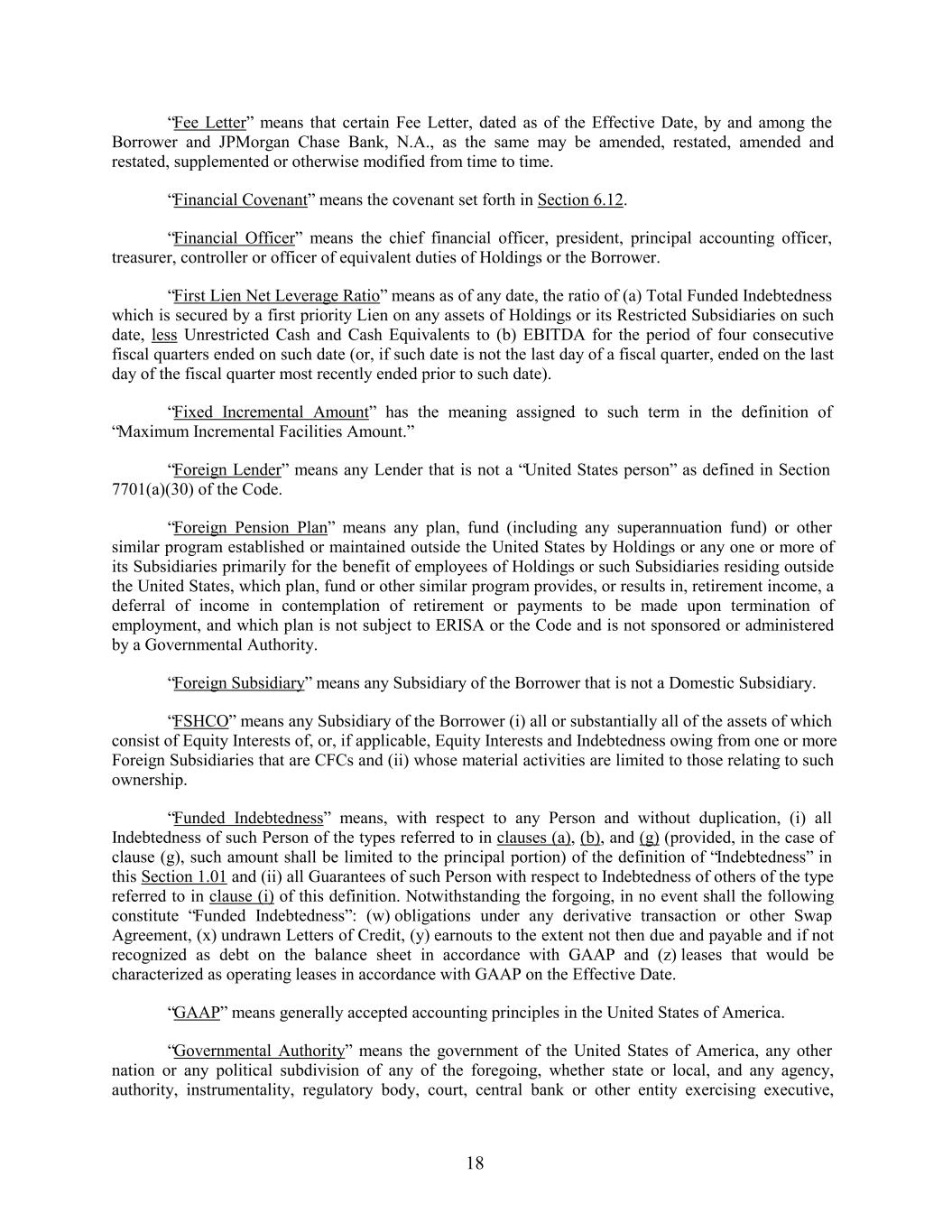 “Fee Letter” means that certain Fee Letter, dated as of the Effective Date, by and among the Borrower and JPMorgan Chase Bank, N.A., as the same may be amended, restated, amended and restated, supplemented or otherwise modified from time to time. “Financial Covenant” means the covenant set forth in Section 6.12. “Financial Officer” means the chief financial officer, president, principal accounting officer, treasurer, controller or officer of equivalent duties of Holdings or the Borrower. “First Lien Net Leverage Ratio” means as of any date, the ratio of (a) Total Funded Indebtedness which is secured by a first priority Lien on any assets of Holdings or its Restricted Subsidiaries on such date, less Unrestricted Cash and Cash Equivalents to (b) EBITDA for the period of four consecutive fiscal quarters ended on such date (or, if such date is not the last day of a fiscal quarter, ended on the last day of the fiscal quarter most recently ended prior to such date). “Fixed Incremental Amount” has the meaning assigned to such term in the definition of “Maximum Incremental Facilities Amount.” “Foreign Lender” means any Lender that is not a “United States person” as defined in Section 7701(a)(30) of the Code. “Foreign Pension Plan” means any plan, fund (including any superannuation fund) or other similar program established or maintained outside the United States by Holdings or any one or more of its Subsidiaries primarily for the benefit of employees of Holdings or such Subsidiaries residing outside the United States, which plan, fund or other similar program provides, or results in, retirement income, a deferral of income in contemplation of retirement or payments to be made upon termination of employment, and which plan is not subject to ERISA or the Code and is not sponsored or administered by a Governmental Authority. “Foreign Subsidiary” means any Subsidiary of the Borrower that is not a Domestic Subsidiary. “FSHCO” means any Subsidiary of the Borrower (i) all or substantially all of the assets of which consist of Equity Interests of, or, if applicable, Equity Interests and Indebtedness owing from one or more Foreign Subsidiaries that are CFCs and (ii) whose material activities are limited to those relating to such ownership. “Funded Indebtedness” means, with respect to any Person and without duplication, (i) all Indebtedness of such Person of the types referred to in clauses (a), (b), and (g) (provided, in the case of clause (g), such amount shall be limited to the principal portion) of the definition of “Indebtedness” in this Section 1.01 and (ii) all Guarantees of such Person with respect to Indebtedness of others of the type referred to in clause (i) of this definition. Notwithstanding the forgoing, in no event shall the following constitute “Funded Indebtedness”: (w) obligations under any derivative transaction or other Swap Agreement, (x) undrawn Letters of Credit, (y) earnouts to the extent not then due and payable and if not recognized as debt on the balance sheet in accordance with GAAP and (z) leases that would be characterized as operating leases in accordance with GAAP on the Effective Date. “GAAP” means generally accepted accounting principles in the United States of America. “Governmental Authority” means the government of the United States of America, any other nation or any political subdivision of any of the foregoing, whether state or local, and any agency, authority, instrumentality, regulatory body, court, central bank or other entity exercising executive, 18