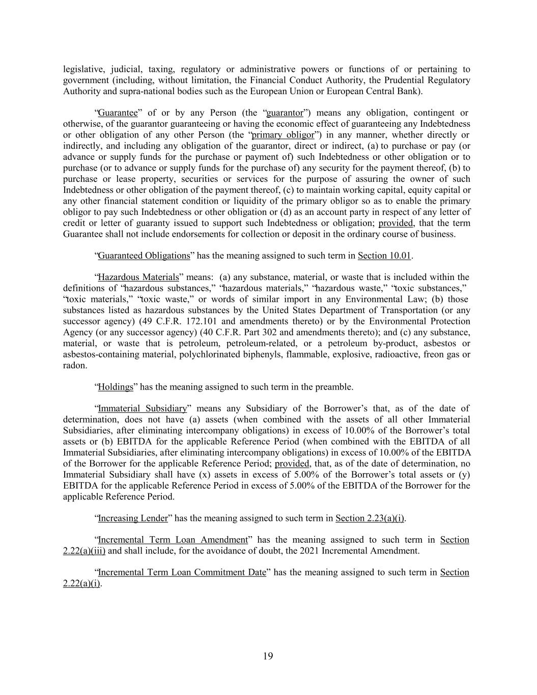legislative, judicial, taxing, regulatory or administrative powers or functions of or pertaining to government (including, without limitation, the Financial Conduct Authority, the Prudential Regulatory Authority and supra-national bodies such as the European Union or European Central Bank). “Guarantee” of or by any Person (the “guarantor”) means any obligation, contingent or otherwise, of the guarantor guaranteeing or having the economic effect of guaranteeing any Indebtedness or other obligation of any other Person (the “primary obligor”) in any manner, whether directly or indirectly, and including any obligation of the guarantor, direct or indirect, (a) to purchase or pay (or advance or supply funds for the purchase or payment of) such Indebtedness or other obligation or to purchase (or to advance or supply funds for the purchase of) any security for the payment thereof, (b) to purchase or lease property, securities or services for the purpose of assuring the owner of such Indebtedness or other obligation of the payment thereof, (c) to maintain working capital, equity capital or any other financial statement condition or liquidity of the primary obligor so as to enable the primary obligor to pay such Indebtedness or other obligation or (d) as an account party in respect of any letter of credit or letter of guaranty issued to support such Indebtedness or obligation; provided, that the term Guarantee shall not include endorsements for collection or deposit in the ordinary course of business. “Guaranteed Obligations” has the meaning assigned to such term in Section 10.01. “Hazardous Materials” means: (a) any substance, material, or waste that is included within the definitions of “hazardous substances,” “hazardous materials,” “hazardous waste,” “toxic substances,” “toxic materials,” “toxic waste,” or words of similar import in any Environmental Law; (b) those substances listed as hazardous substances by the United States Department of Transportation (or any successor agency) (49 C.F.R. 172.101 and amendments thereto) or by the Environmental Protection Agency (or any successor agency) (40 C.F.R. Part 302 and amendments thereto); and (c) any substance, material, or waste that is petroleum, petroleum-related, or a petroleum by-product, asbestos or asbestos-containing material, polychlorinated biphenyls, flammable, explosive, radioactive, freon gas or radon. “Holdings” has the meaning assigned to such term in the preamble. “Immaterial Subsidiary” means any Subsidiary of the Borrower’s that, as of the date of determination, does not have (a) assets (when combined with the assets of all other Immaterial Subsidiaries, after eliminating intercompany obligations) in excess of 10.00% of the Borrower’s total assets or (b) EBITDA for the applicable Reference Period (when combined with the EBITDA of all Immaterial Subsidiaries, after eliminating intercompany obligations) in excess of 10.00% of the EBITDA of the Borrower for the applicable Reference Period; provided, that, as of the date of determination, no Immaterial Subsidiary shall have (x) assets in excess of 5.00% of the Borrower’s total assets or (y) EBITDA for the applicable Reference Period in excess of 5.00% of the EBITDA of the Borrower for the applicable Reference Period. “Increasing Lender” has the meaning assigned to such term in Section 2.23(a)(i). “Incremental Term Loan Amendment” has the meaning assigned to such term in Section 2.22(a)(iii) and shall include, for the avoidance of doubt, the 2021 Incremental Amendment. “Incremental Term Loan Commitment Date” has the meaning assigned to such term in Section 2.22(a)(i). 19