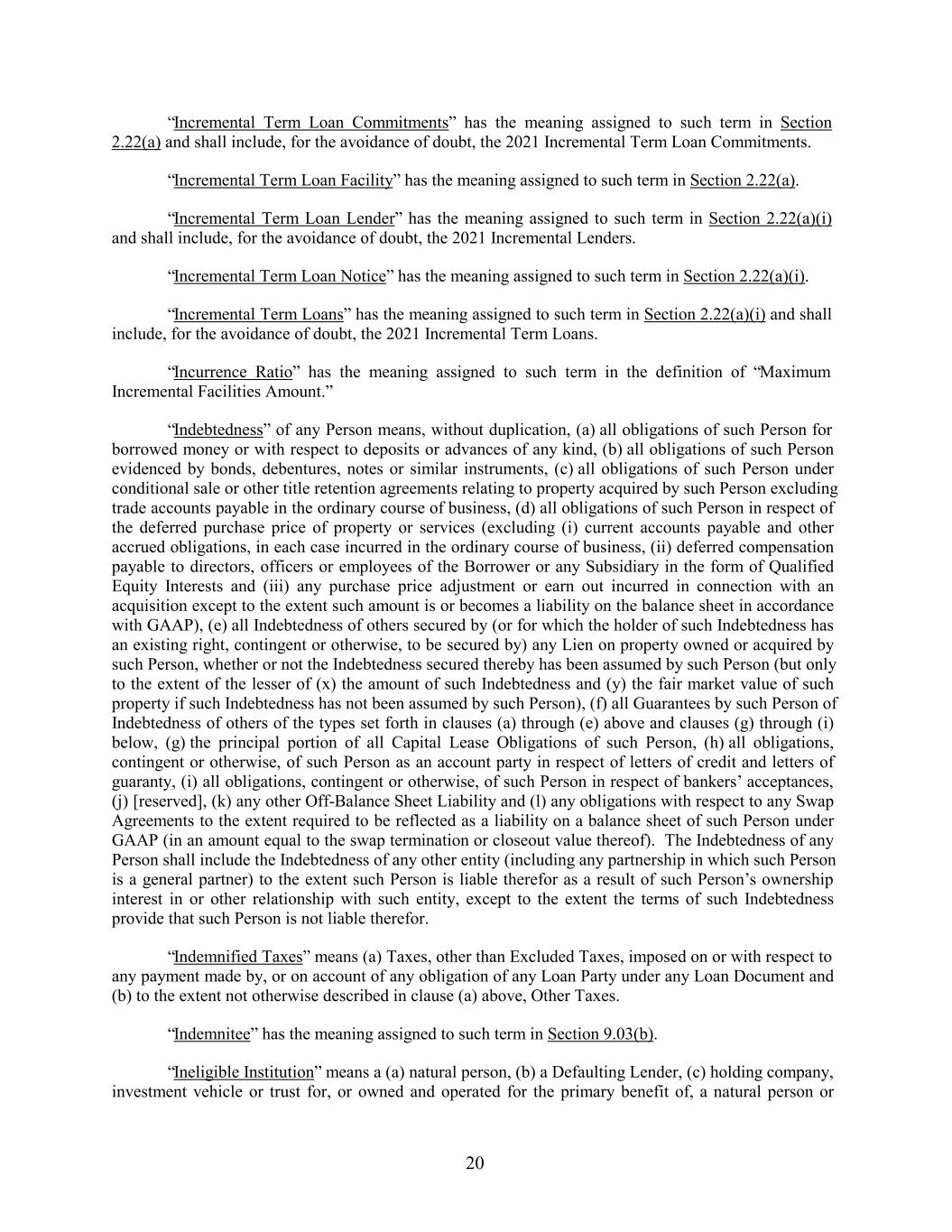 “Incremental Term Loan Commitments” has the meaning assigned to such term in Section 2.22(a) and shall include, for the avoidance of doubt, the 2021 Incremental Term Loan Commitments. “Incremental Term Loan Facility” has the meaning assigned to such term in Section 2.22(a). “Incremental Term Loan Lender” has the meaning assigned to such term in Section 2.22(a)(i) and shall include, for the avoidance of doubt, the 2021 Incremental Lenders. “Incremental Term Loan Notice” has the meaning assigned to such term in Section 2.22(a)(i). “Incremental Term Loans” has the meaning assigned to such term in Section 2.22(a)(i) and shall include, for the avoidance of doubt, the 2021 Incremental Term Loans. “Incurrence Ratio” has the meaning assigned to such term in the definition of “Maximum Incremental Facilities Amount.” “Indebtedness” of any Person means, without duplication, (a) all obligations of such Person for borrowed money or with respect to deposits or advances of any kind, (b) all obligations of such Person evidenced by bonds, debentures, notes or similar instruments, (c) all obligations of such Person under conditional sale or other title retention agreements relating to property acquired by such Person excluding trade accounts payable in the ordinary course of business, (d) all obligations of such Person in respect of the deferred purchase price of property or services (excluding (i) current accounts payable and other accrued obligations, in each case incurred in the ordinary course of business, (ii) deferred compensation payable to directors, officers or employees of the Borrower or any Subsidiary in the form of Qualified Equity Interests and (iii) any purchase price adjustment or earn out incurred in connection with an acquisition except to the extent such amount is or becomes a liability on the balance sheet in accordance with GAAP), (e) all Indebtedness of others secured by (or for which the holder of such Indebtedness has an existing right, contingent or otherwise, to be secured by) any Lien on property owned or acquired by such Person, whether or not the Indebtedness secured thereby has been assumed by such Person (but only to the extent of the lesser of (x) the amount of such Indebtedness and (y) the fair market value of such property if such Indebtedness has not been assumed by such Person), (f) all Guarantees by such Person of Indebtedness of others of the types set forth in clauses (a) through (e) above and clauses (g) through (i) below, (g) the principal portion of all Capital Lease Obligations of such Person, (h) all obligations, contingent or otherwise, of such Person as an account party in respect of letters of credit and letters of guaranty, (i) all obligations, contingent or otherwise, of such Person in respect of bankers’ acceptances, (j) [reserved], (k) any other Off-Balance Sheet Liability and (l) any obligations with respect to any Swap Agreements to the extent required to be reflected as a liability on a balance sheet of such Person under GAAP (in an amount equal to the swap termination or closeout value thereof). The Indebtedness of any Person shall include the Indebtedness of any other entity (including any partnership in which such Person is a general partner) to the extent such Person is liable therefor as a result of such Person’s ownership interest in or other relationship with such entity, except to the extent the terms of such Indebtedness provide that such Person is not liable therefor. “Indemnified Taxes” means (a) Taxes, other than Excluded Taxes, imposed on or with respect to any payment made by, or on account of any obligation of any Loan Party under any Loan Document and (b) to the extent not otherwise described in clause (a) above, Other Taxes. “Indemnitee” has the meaning assigned to such term in Section 9.03(b). “Ineligible Institution” means a (a) natural person, (b) a Defaulting Lender, (c) holding company, investment vehicle or trust for, or owned and operated for the primary benefit of, a natural person or 20