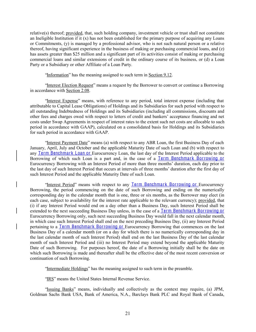 relative(s) thereof; provided, that, such holding company, investment vehicle or trust shall not constitute an Ineligible Institution if it (x) has not been established for the primary purpose of acquiring any Loans or Commitments, (y) is managed by a professional advisor, who is not such natural person or a relative thereof, having significant experience in the business of making or purchasing commercial loans, and (z) has assets greater than $25 million and a significant part of its activities consist of making or purchasing commercial loans and similar extensions of credit in the ordinary course of its business, or (d) a Loan Party or a Subsidiary or other Affiliate of a Loan Party. “Information” has the meaning assigned to such term in Section 9.12. “Interest Election Request” means a request by the Borrower to convert or continue a Borrowing in accordance with Section 2.08. “Interest Expense” means, with reference to any period, total interest expense (including that attributable to Capital Lease Obligations) of Holdings and its Subsidiaries for such period with respect to all outstanding Indebtedness of Holdings and its Subsidiaries (including all commissions, discounts and other fees and charges owed with respect to letters of credit and bankers’ acceptance financing and net costs under Swap Agreements in respect of interest rates to the extent such net costs are allocable to such period in accordance with GAAP), calculated on a consolidated basis for Holdings and its Subsidiaries for such period in accordance with GAAP. “Interest Payment Date” means (a) with respect to any ABR Loan, the first Business Day of each January, April, July and October and the applicable Maturity Date of such Loan and (b) with respect to any Term Benchmark Loan or Eurocurrency Loan, the last day of the Interest Period applicable to the Borrowing of which such Loan is a part and, in the case of a Term Benchmark Bor rowing or Eurocurrency Borrowing with an Interest Period of more than three months’ duration, each day prior to the last day of such Interest Period that occurs at intervals of three months’ duration after the first day of such Interest Period and the applicable Maturity Date of such Loan. “Interest Period” means with respect to any Term Benchmark Bor rowing or Eurocurrency Borrowing, the period commencing on the date of such Borrowing and ending on the numerically corresponding day in the calendar month that is one, three or six months, as the Borrower may elect (in each case, subject to availability for the interest rate applicable to the relevant currency); provided, that (i) if any Interest Period would end on a day other than a Business Day, such Interest Period shall be extended to the next succeeding Business Day unless, in the case of a Term Benchmark Bor rowing or Eurocurrency Borrowing only, such next succeeding Business Day would fall in the next calendar month, in which case such Interest Period shall end on the next preceding Business Day, (ii) any Interest Period pertaining to a Term Benchmark Bor rowing or Eurocurrency Borrowing that commences on the last Business Day of a calendar month (or on a day for which there is no numerically corresponding day in the last calendar month of such Interest Period) shall end on the last Business Day of the last calendar month of such Interest Period and (iii) no Interest Period may extend beyond the applicable Maturity Date of such Borrowing. For purposes hereof, the date of a Borrowing initially shall be the date on which such Borrowing is made and thereafter shall be the effective date of the most recent conversion or continuation of such Borrowing. “Intermediate Holdings” has the meaning assigned to such term in the preamble. “IRS” means the United States Internal Revenue Service. “Issuing Banks” means, individually and collectively as the context may require, (a) JPM, Goldman Sachs Bank USA, Bank of America, N.A., Barclays Bank PLC and Royal Bank of Canada, 21