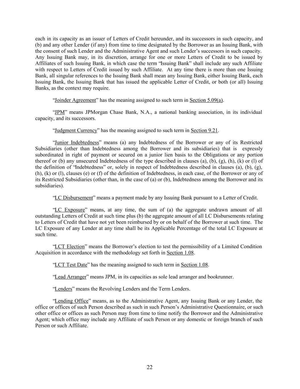each in its capacity as an issuer of Letters of Credit hereunder, and its successors in such capacity, and (b) and any other Lender (if any) from time to time designated by the Borrower as an Issuing Bank, with the consent of such Lender and the Administrative Agent and such Lender’s successors in such capacity. Any Issuing Bank may, in its discretion, arrange for one or more Letters of Credit to be issued by Affiliates of such Issuing Bank, in which case the term “Issuing Bank” shall include any such Affiliate with respect to Letters of Credit issued by such Affiliate. At any time there is more than one Issuing Bank, all singular references to the Issuing Bank shall mean any Issuing Bank, either Issuing Bank, each Issuing Bank, the Issuing Bank that has issued the applicable Letter of Credit, or both (or all) Issuing Banks, as the context may require. “Joinder Agreement” has the meaning assigned to such term in Section 5.09(a). “JPM” means JPMorgan Chase Bank, N.A., a national banking association, in its individual capacity, and its successors. “Judgment Currency” has the meaning assigned to such term in Section 9.21. “Junior Indebtedness” means (a) any Indebtedness of the Borrower or any of its Restricted Subsidiaries (other than Indebtedness among the Borrower and its subsidiaries) that is expressly subordinated in right of payment or secured on a junior lien basis to the Obligations or any portion thereof or (b) any unsecured Indebtedness of the type described in clauses (a), (b), (g), (h), (k) or (l) of the definition of “Indebtedness” or, solely in respect of Indebtedness described in clauses (a), (b), (g), (h), (k) or (l), clauses (e) or (f) of the definition of Indebtedness, in each case, of the Borrower or any of its Restricted Subsidiaries (other than, in the case of (a) or (b), Indebtedness among the Borrower and its subsidiaries). “LC Disbursement” means a payment made by any Issuing Bank pursuant to a Letter of Credit. “LC Exposure” means, at any time, the sum of (a) the aggregate undrawn amount of all outstanding Letters of Credit at such time plus (b) the aggregate amount of all LC Disbursements relating to Letters of Credit that have not yet been reimbursed by or on behalf of the Borrower at such time. The LC Exposure of any Lender at any time shall be its Applicable Percentage of the total LC Exposure at such time. “LCT Election” means the Borrower’s election to test the permissibility of a Limited Condition Acquisition in accordance with the methodology set forth in Section 1.08. “LCT Test Date” has the meaning assigned to such term in Section 1.08. “Lead Arranger” means JPM, in its capacities as sole lead arranger and bookrunner. “Lenders” means the Revolving Lenders and the Term Lenders. “Lending Office” means, as to the Administrative Agent, any Issuing Bank or any Lender, the office or offices of such Person described as such in such Person’s Administrative Questionnaire, or such other office or offices as such Person may from time to time notify the Borrower and the Administrative Agent; which office may include any Affiliate of such Person or any domestic or foreign branch of such Person or such Affiliate. 22