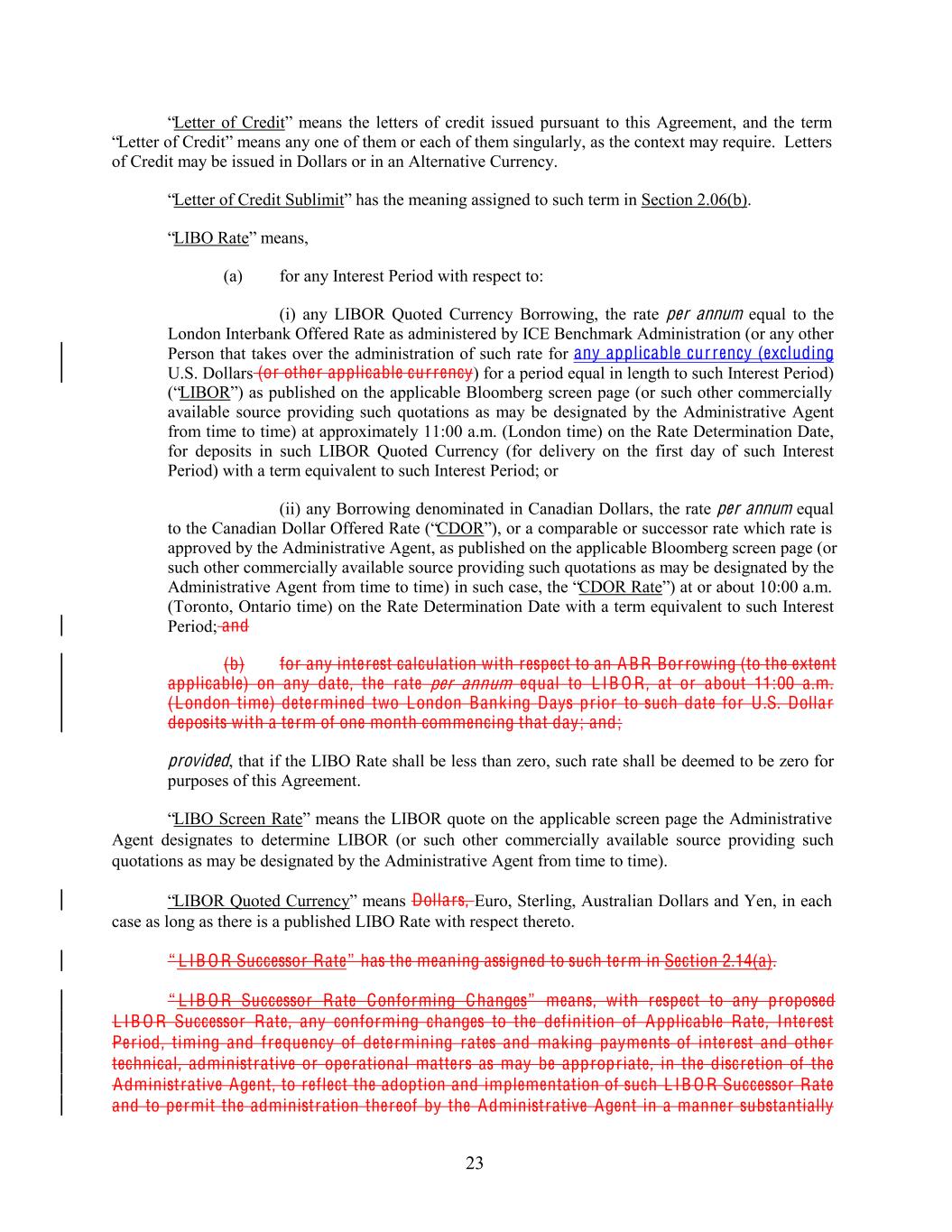 “Letter of Credit” means the letters of credit issued pursuant to this Agreement, and the term “Letter of Credit” means any one of them or each of them singularly, as the context may require. Letters of Credit may be issued in Dollars or in an Alternative Currency. “Letter of Credit Sublimit” has the meaning assigned to such term in Section 2.06(b). “LIBO Rate” means, (a) for any Interest Period with respect to: (i) any LIBOR Quoted Currency Borrowing, the rate per annum equal to the London Interbank Offered Rate as administered by ICE Benchmark Administration (or any other Person that takes over the administration of such rate for any applicable cur rency (excluding U.S. Dollars (or other applicable cur rency) for a period equal in length to such Interest Period) (“LIBOR”) as published on the applicable Bloomberg screen page (or such other commercially available source providing such quotations as may be designated by the Administrative Agent from time to time) at approximately 11:00 a.m. (London time) on the Rate Determination Date, for deposits in such LIBOR Quoted Currency (for delivery on the first day of such Interest Period) with a term equivalent to such Interest Period; or (ii) any Borrowing denominated in Canadian Dollars, the rate per annum equal to the Canadian Dollar Offered Rate (“CDOR”), or a comparable or successor rate which rate is approved by the Administrative Agent, as published on the applicable Bloomberg screen page (or such other commercially available source providing such quotations as may be designated by the Administrative Agent from time to time) in such case, the “CDOR Rate”) at or about 10:00 a.m. (Toronto, Ontario time) on the Rate Determination Date with a term equivalent to such Interest Period; and (b) for any interest calculation with respect to an A BR Bor rowing (to the extent applicable) on any date, the rate per annum equal to L IB O R , at or about 11:00 a.m. (London time) determined two London Banking Days prior to such date for U .S. Dollar deposits with a term of one month commencing that day; and; provided, that if the LIBO Rate shall be less than zero, such rate shall be deemed to be zero for purposes of this Agreement. “LIBO Screen Rate” means the LIBOR quote on the applicable screen page the Administrative Agent designates to determine LIBOR (or such other commercially available source providing such quotations as may be designated by the Administrative Agent from time to time). “LIBOR Quoted Currency” means Dollars, Euro, Sterling, Australian Dollars and Yen, in each case as long as there is a published LIBO Rate with respect thereto. “ L IB O R Successor Rate” has the meaning assigned to such term in Section 2.14(a). “ L IB O R Successor Rate Conforming Changes” means, with respect to any proposed L IB O R Successor Rate, any conforming changes to the definition of Applicable Rate, Interest Per iod, timing and frequency of determining rates and making payments of interest and other technical, administrative or operational matters as may be appropriate, in the discretion of the Administrative Agent, to reflect the adoption and implementation of such L IB O R Successor Rate and to permit the administration thereof by the Administrative Agent in a manner substantially 23