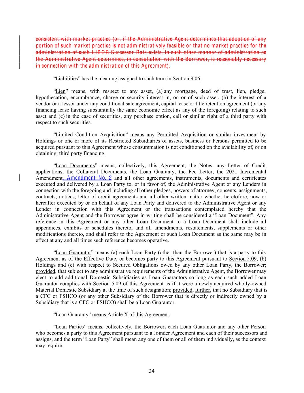 consistent with market practice (or , if the Administrative Agent determines that adoption of any portion of such market practice is not administratively feasible or that no market practice for the administration of such L IB O R Successor Rate exists, in such other manner of administration as the Administrative Agent determines, in consultation with the Bor rower , is reasonably necessary in connection with the administration of this Agreement). “Liabilities” has the meaning assigned to such term in Section 9.06. “Lien” means, with respect to any asset, (a) any mortgage, deed of trust, lien, pledge, hypothecation, encumbrance, charge or security interest in, on or of such asset, (b) the interest of a vendor or a lessor under any conditional sale agreement, capital lease or title retention agreement (or any financing lease having substantially the same economic effect as any of the foregoing) relating to such asset and (c) in the case of securities, any purchase option, call or similar right of a third party with respect to such securities. “Limited Condition Acquisition” means any Permitted Acquisition or similar investment by Holdings or one or more of its Restricted Subsidiaries of assets, business or Persons permitted to be acquired pursuant to this Agreement whose consummation is not conditioned on the availability of, or on obtaining, third party financing. “Loan Documents” means, collectively, this Agreement, the Notes, any Letter of Credit applications, the Collateral Documents, the Loan Guaranty, the Fee Letter, the 2021 Incremental Amendment, Amendment No. 2 and all other agreements, instruments, documents and certificates executed and delivered by a Loan Party to, or in favor of, the Administrative Agent or any Lenders in connection with the foregoing and including all other pledges, powers of attorney, consents, assignments, contracts, notices, letter of credit agreements and all other written matter whether heretofore, now or hereafter executed by or on behalf of any Loan Party and delivered to the Administrative Agent or any Lender in connection with this Agreement or the transactions contemplated hereby that the Administrative Agent and the Borrower agree in writing shall be considered a “Loan Document”. Any reference in this Agreement or any other Loan Document to a Loan Document shall include all appendices, exhibits or schedules thereto, and all amendments, restatements, supplements or other modifications thereto, and shall refer to the Agreement or such Loan Document as the same may be in effect at any and all times such reference becomes operative. “Loan Guarantor” means (a) each Loan Party (other than the Borrower) that is a party to this Agreement as of the Effective Date, or becomes party to this Agreement pursuant to Section 5.09, (b) Holdings and (c) with respect to Secured Obligations owed by any other Loan Party, the Borrower; provided, that subject to any administrative requirements of the Administrative Agent, the Borrower may elect to add additional Domestic Subsidiaries as Loan Guarantors so long as each such added Loan Guarantor complies with Section 5.09 of this Agreement as if it were a newly acquired wholly-owned Material Domestic Subsidiary at the time of such designation; provided, further, that no Subsidiary that is a CFC or FSHCO (or any other Subsidiary of the Borrower that is directly or indirectly owned by a Subsidiary that is a CFC or FSHCO) shall be a Loan Guarantor. “Loan Guaranty” means Article X of this Agreement. “Loan Parties” means, collectively, the Borrower, each Loan Guarantor and any other Person who becomes a party to this Agreement pursuant to a Joinder Agreement and each of their successors and assigns, and the term “Loan Party” shall mean any one of them or all of them individually, as the context may require. 24