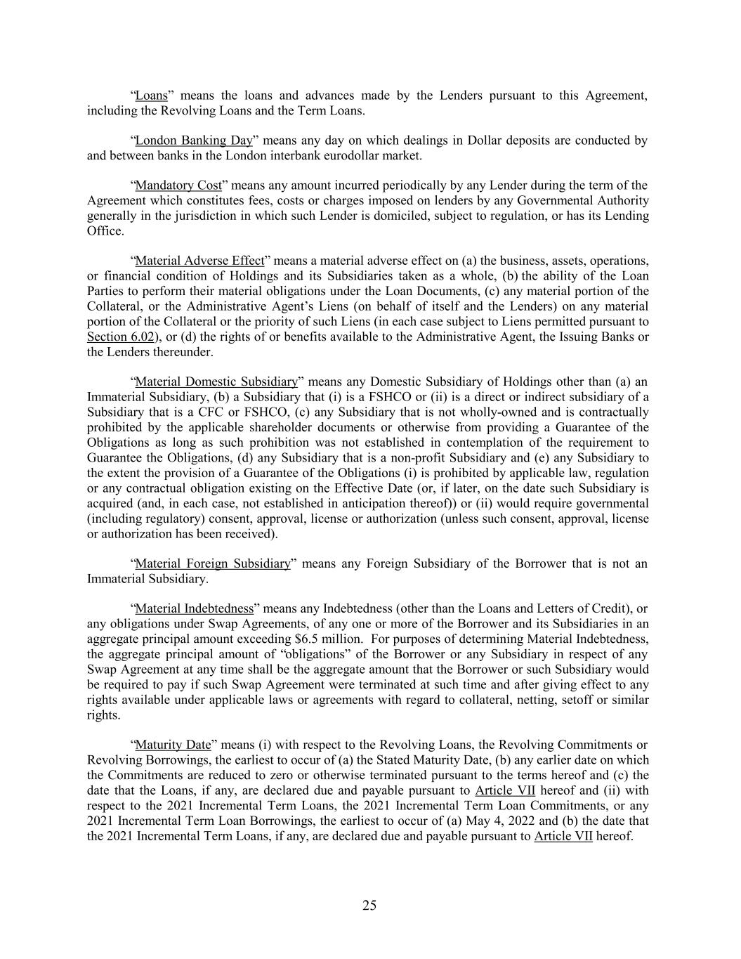 “Loans” means the loans and advances made by the Lenders pursuant to this Agreement, including the Revolving Loans and the Term Loans. “London Banking Day” means any day on which dealings in Dollar deposits are conducted by and between banks in the London interbank eurodollar market. “Mandatory Cost” means any amount incurred periodically by any Lender during the term of the Agreement which constitutes fees, costs or charges imposed on lenders by any Governmental Authority generally in the jurisdiction in which such Lender is domiciled, subject to regulation, or has its Lending Office. “Material Adverse Effect” means a material adverse effect on (a) the business, assets, operations, or financial condition of Holdings and its Subsidiaries taken as a whole, (b) the ability of the Loan Parties to perform their material obligations under the Loan Documents, (c) any material portion of the Collateral, or the Administrative Agent’s Liens (on behalf of itself and the Lenders) on any material portion of the Collateral or the priority of such Liens (in each case subject to Liens permitted pursuant to Section 6.02), or (d) the rights of or benefits available to the Administrative Agent, the Issuing Banks or the Lenders thereunder. “Material Domestic Subsidiary” means any Domestic Subsidiary of Holdings other than (a) an Immaterial Subsidiary, (b) a Subsidiary that (i) is a FSHCO or (ii) is a direct or indirect subsidiary of a Subsidiary that is a CFC or FSHCO, (c) any Subsidiary that is not wholly-owned and is contractually prohibited by the applicable shareholder documents or otherwise from providing a Guarantee of the Obligations as long as such prohibition was not established in contemplation of the requirement to Guarantee the Obligations, (d) any Subsidiary that is a non-profit Subsidiary and (e) any Subsidiary to the extent the provision of a Guarantee of the Obligations (i) is prohibited by applicable law, regulation or any contractual obligation existing on the Effective Date (or, if later, on the date such Subsidiary is acquired (and, in each case, not established in anticipation thereof)) or (ii) would require governmental (including regulatory) consent, approval, license or authorization (unless such consent, approval, license or authorization has been received). “Material Foreign Subsidiary” means any Foreign Subsidiary of the Borrower that is not an Immaterial Subsidiary. “Material Indebtedness” means any Indebtedness (other than the Loans and Letters of Credit), or any obligations under Swap Agreements, of any one or more of the Borrower and its Subsidiaries in an aggregate principal amount exceeding $6.5 million. For purposes of determining Material Indebtedness, the aggregate principal amount of “obligations” of the Borrower or any Subsidiary in respect of any Swap Agreement at any time shall be the aggregate amount that the Borrower or such Subsidiary would be required to pay if such Swap Agreement were terminated at such time and after giving effect to any rights available under applicable laws or agreements with regard to collateral, netting, setoff or similar rights. “Maturity Date” means (i) with respect to the Revolving Loans, the Revolving Commitments or Revolving Borrowings, the earliest to occur of (a) the Stated Maturity Date, (b) any earlier date on which the Commitments are reduced to zero or otherwise terminated pursuant to the terms hereof and (c) the date that the Loans, if any, are declared due and payable pursuant to Article VII hereof and (ii) with respect to the 2021 Incremental Term Loans, the 2021 Incremental Term Loan Commitments, or any 2021 Incremental Term Loan Borrowings, the earliest to occur of (a) May 4, 2022 and (b) the date that the 2021 Incremental Term Loans, if any, are declared due and payable pursuant to Article VII hereof. 25