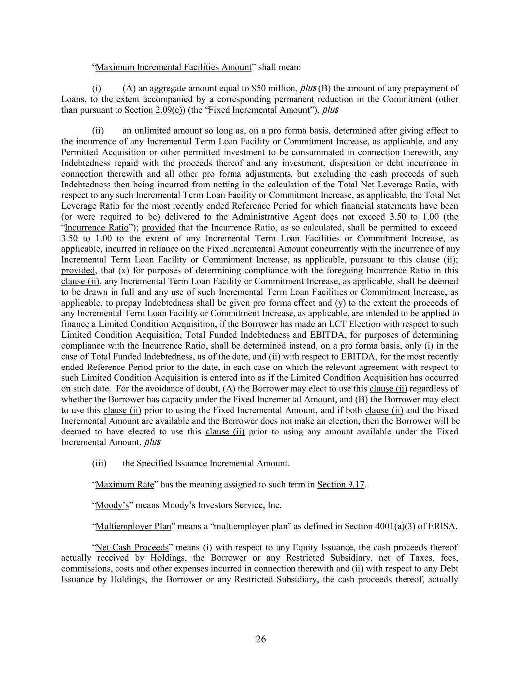“Maximum Incremental Facilities Amount” shall mean: (i) (A) an aggregate amount equal to $50 million, plus (B) the amount of any prepayment of Loans, to the extent accompanied by a corresponding permanent reduction in the Commitment (other than pursuant to Section 2.09(e)) (the “Fixed Incremental Amount”), plus (ii) an unlimited amount so long as, on a pro forma basis, determined after giving effect to the incurrence of any Incremental Term Loan Facility or Commitment Increase, as applicable, and any Permitted Acquisition or other permitted investment to be consummated in connection therewith, any Indebtedness repaid with the proceeds thereof and any investment, disposition or debt incurrence in connection therewith and all other pro forma adjustments, but excluding the cash proceeds of such Indebtedness then being incurred from netting in the calculation of the Total Net Leverage Ratio, with respect to any such Incremental Term Loan Facility or Commitment Increase, as applicable, the Total Net Leverage Ratio for the most recently ended Reference Period for which financial statements have been (or were required to be) delivered to the Administrative Agent does not exceed 3.50 to 1.00 (the “Incurrence Ratio”); provided that the Incurrence Ratio, as so calculated, shall be permitted to exceed 3.50 to 1.00 to the extent of any Incremental Term Loan Facilities or Commitment Increase, as applicable, incurred in reliance on the Fixed Incremental Amount concurrently with the incurrence of any Incremental Term Loan Facility or Commitment Increase, as applicable, pursuant to this clause (ii); provided, that (x) for purposes of determining compliance with the foregoing Incurrence Ratio in this clause (ii), any Incremental Term Loan Facility or Commitment Increase, as applicable, shall be deemed to be drawn in full and any use of such Incremental Term Loan Facilities or Commitment Increase, as applicable, to prepay Indebtedness shall be given pro forma effect and (y) to the extent the proceeds of any Incremental Term Loan Facility or Commitment Increase, as applicable, are intended to be applied to finance a Limited Condition Acquisition, if the Borrower has made an LCT Election with respect to such Limited Condition Acquisition, Total Funded Indebtedness and EBITDA, for purposes of determining compliance with the Incurrence Ratio, shall be determined instead, on a pro forma basis, only (i) in the case of Total Funded Indebtedness, as of the date, and (ii) with respect to EBITDA, for the most recently ended Reference Period prior to the date, in each case on which the relevant agreement with respect to such Limited Condition Acquisition is entered into as if the Limited Condition Acquisition has occurred on such date. For the avoidance of doubt, (A) the Borrower may elect to use this clause (ii) regardless of whether the Borrower has capacity under the Fixed Incremental Amount, and (B) the Borrower may elect to use this clause (ii) prior to using the Fixed Incremental Amount, and if both clause (ii) and the Fixed Incremental Amount are available and the Borrower does not make an election, then the Borrower will be deemed to have elected to use this clause (ii) prior to using any amount available under the Fixed Incremental Amount, plus (iii) the Specified Issuance Incremental Amount. “Maximum Rate” has the meaning assigned to such term in Section 9.17. “Moody’s” means Moody’s Investors Service, Inc. “Multiemployer Plan” means a “multiemployer plan” as defined in Section 4001(a)(3) of ERISA. “Net Cash Proceeds” means (i) with respect to any Equity Issuance, the cash proceeds thereof actually received by Holdings, the Borrower or any Restricted Subsidiary, net of Taxes, fees, commissions, costs and other expenses incurred in connection therewith and (ii) with respect to any Debt Issuance by Holdings, the Borrower or any Restricted Subsidiary, the cash proceeds thereof, actually 26