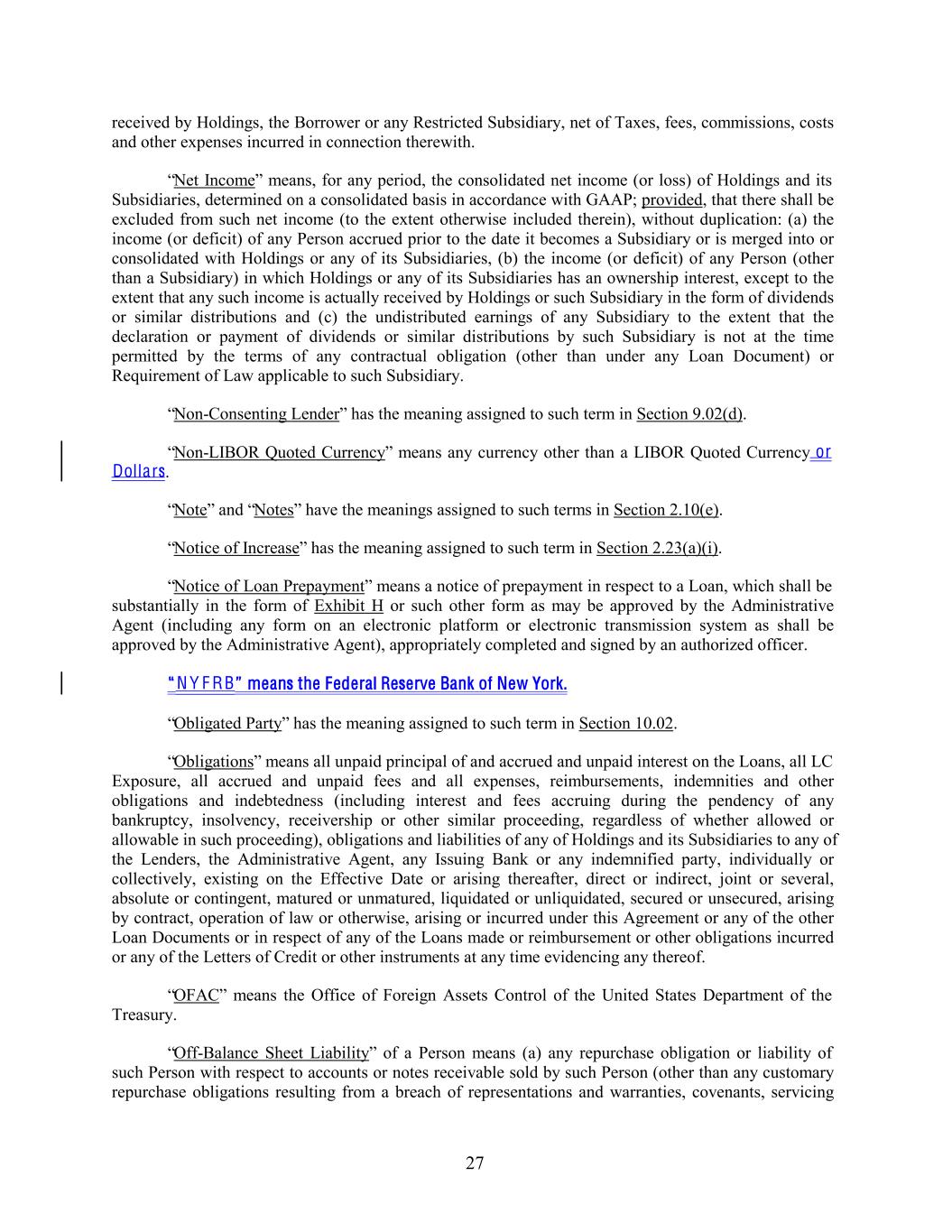 received by Holdings, the Borrower or any Restricted Subsidiary, net of Taxes, fees, commissions, costs and other expenses incurred in connection therewith. “Net Income” means, for any period, the consolidated net income (or loss) of Holdings and its Subsidiaries, determined on a consolidated basis in accordance with GAAP; provided, that there shall be excluded from such net income (to the extent otherwise included therein), without duplication: (a) the income (or deficit) of any Person accrued prior to the date it becomes a Subsidiary or is merged into or consolidated with Holdings or any of its Subsidiaries, (b) the income (or deficit) of any Person (other than a Subsidiary) in which Holdings or any of its Subsidiaries has an ownership interest, except to the extent that any such income is actually received by Holdings or such Subsidiary in the form of dividends or similar distributions and (c) the undistributed earnings of any Subsidiary to the extent that the declaration or payment of dividends or similar distributions by such Subsidiary is not at the time permitted by the terms of any contractual obligation (other than under any Loan Document) or Requirement of Law applicable to such Subsidiary. “Non-Consenting Lender” has the meaning assigned to such term in Section 9.02(d). “Non-LIBOR Quoted Currency” means any currency other than a LIBOR Quoted Currency or Dollars. “Note” and “Notes” have the meanings assigned to such terms in Section 2.10(e). “Notice of Increase” has the meaning assigned to such term in Section 2.23(a)(i). “Notice of Loan Prepayment” means a notice of prepayment in respect to a Loan, which shall be substantially in the form of Exhibit H or such other form as may be approved by the Administrative Agent (including any form on an electronic platform or electronic transmission system as shall be approved by the Administrative Agent), appropriately completed and signed by an authorized officer. “ N Y F RB” means the Federal Reserve Bank of New York. “Obligated Party” has the meaning assigned to such term in Section 10.02. “Obligations” means all unpaid principal of and accrued and unpaid interest on the Loans, all LC Exposure, all accrued and unpaid fees and all expenses, reimbursements, indemnities and other obligations and indebtedness (including interest and fees accruing during the pendency of any bankruptcy, insolvency, receivership or other similar proceeding, regardless of whether allowed or allowable in such proceeding), obligations and liabilities of any of Holdings and its Subsidiaries to any of the Lenders, the Administrative Agent, any Issuing Bank or any indemnified party, individually or collectively, existing on the Effective Date or arising thereafter, direct or indirect, joint or several, absolute or contingent, matured or unmatured, liquidated or unliquidated, secured or unsecured, arising by contract, operation of law or otherwise, arising or incurred under this Agreement or any of the other Loan Documents or in respect of any of the Loans made or reimbursement or other obligations incurred or any of the Letters of Credit or other instruments at any time evidencing any thereof. “OFAC” means the Office of Foreign Assets Control of the United States Department of the Treasury. “Off-Balance Sheet Liability” of a Person means (a) any repurchase obligation or liability of such Person with respect to accounts or notes receivable sold by such Person (other than any customary repurchase obligations resulting from a breach of representations and warranties, covenants, servicing 27