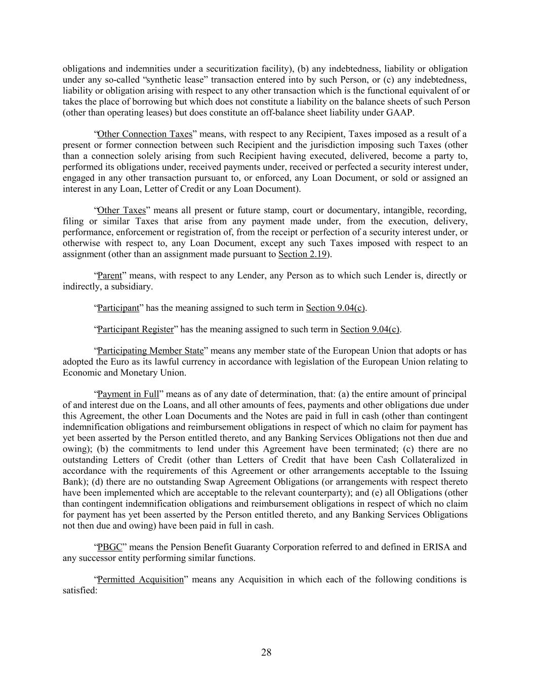 obligations and indemnities under a securitization facility), (b) any indebtedness, liability or obligation under any so-called “synthetic lease” transaction entered into by such Person, or (c) any indebtedness, liability or obligation arising with respect to any other transaction which is the functional equivalent of or takes the place of borrowing but which does not constitute a liability on the balance sheets of such Person (other than operating leases) but does constitute an off-balance sheet liability under GAAP. “Other Connection Taxes” means, with respect to any Recipient, Taxes imposed as a result of a present or former connection between such Recipient and the jurisdiction imposing such Taxes (other than a connection solely arising from such Recipient having executed, delivered, become a party to, performed its obligations under, received payments under, received or perfected a security interest under, engaged in any other transaction pursuant to, or enforced, any Loan Document, or sold or assigned an interest in any Loan, Letter of Credit or any Loan Document). “Other Taxes” means all present or future stamp, court or documentary, intangible, recording, filing or similar Taxes that arise from any payment made under, from the execution, delivery, performance, enforcement or registration of, from the receipt or perfection of a security interest under, or otherwise with respect to, any Loan Document, except any such Taxes imposed with respect to an assignment (other than an assignment made pursuant to Section 2.19). “Parent” means, with respect to any Lender, any Person as to which such Lender is, directly or indirectly, a subsidiary. “Participant” has the meaning assigned to such term in Section 9.04(c). “Participant Register” has the meaning assigned to such term in Section 9.04(c). “Participating Member State” means any member state of the European Union that adopts or has adopted the Euro as its lawful currency in accordance with legislation of the European Union relating to Economic and Monetary Union. “Payment in Full” means as of any date of determination, that: (a) the entire amount of principal of and interest due on the Loans, and all other amounts of fees, payments and other obligations due under this Agreement, the other Loan Documents and the Notes are paid in full in cash (other than contingent indemnification obligations and reimbursement obligations in respect of which no claim for payment has yet been asserted by the Person entitled thereto, and any Banking Services Obligations not then due and owing); (b) the commitments to lend under this Agreement have been terminated; (c) there are no outstanding Letters of Credit (other than Letters of Credit that have been Cash Collateralized in accordance with the requirements of this Agreement or other arrangements acceptable to the Issuing Bank); (d) there are no outstanding Swap Agreement Obligations (or arrangements with respect thereto have been implemented which are acceptable to the relevant counterparty); and (e) all Obligations (other than contingent indemnification obligations and reimbursement obligations in respect of which no claim for payment has yet been asserted by the Person entitled thereto, and any Banking Services Obligations not then due and owing) have been paid in full in cash. “PBGC” means the Pension Benefit Guaranty Corporation referred to and defined in ERISA and any successor entity performing similar functions. “Permitted Acquisition” means any Acquisition in which each of the following conditions is satisfied: 28