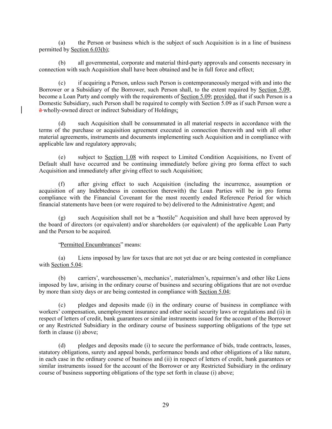 (a) the Person or business which is the subject of such Acquisition is in a line of business permitted by Section 6.03(b); (b) all governmental, corporate and material third-party approvals and consents necessary in connection with such Acquisition shall have been obtained and be in full force and effect; (c) if acquiring a Person, unless such Person is contemporaneously merged with and into the Borrower or a Subsidiary of the Borrower, such Person shall, to the extent required by Section 5.09, become a Loan Party and comply with the requirements of Section 5.09; provided, that if such Person is a Domestic Subsidiary, such Person shall be required to comply with Section 5.09 as if such Person were a a wholly-owned direct or indirect Subsidiary of Holdings; (d) such Acquisition shall be consummated in all material respects in accordance with the terms of the purchase or acquisition agreement executed in connection therewith and with all other material agreements, instruments and documents implementing such Acquisition and in compliance with applicable law and regulatory approvals; (e) subject to Section 1.08 with respect to Limited Condition Acquisitions, no Event of Default shall have occurred and be continuing immediately before giving pro forma effect to such Acquisition and immediately after giving effect to such Acquisition; (f) after giving effect to such Acquisition (including the incurrence, assumption or acquisition of any Indebtedness in connection therewith) the Loan Parties will be in pro forma compliance with the Financial Covenant for the most recently ended Reference Period for which financial statements have been (or were required to be) delivered to the Administrative Agent; and (g) such Acquisition shall not be a “hostile” Acquisition and shall have been approved by the board of directors (or equivalent) and/or shareholders (or equivalent) of the applicable Loan Party and the Person to be acquired. “Permitted Encumbrances” means: (a) Liens imposed by law for taxes that are not yet due or are being contested in compliance with Section 5.04; (b) carriers’, warehousemen’s, mechanics’, materialmen’s, repairmen’s and other like Liens imposed by law, arising in the ordinary course of business and securing obligations that are not overdue by more than sixty days or are being contested in compliance with Section 5.04; (c) pledges and deposits made (i) in the ordinary course of business in compliance with workers’ compensation, unemployment insurance and other social security laws or regulations and (ii) in respect of letters of credit, bank guarantees or similar instruments issued for the account of the Borrower or any Restricted Subsidiary in the ordinary course of business supporting obligations of the type set forth in clause (i) above; (d) pledges and deposits made (i) to secure the performance of bids, trade contracts, leases, statutory obligations, surety and appeal bonds, performance bonds and other obligations of a like nature, in each case in the ordinary course of business and (ii) in respect of letters of credit, bank guarantees or similar instruments issued for the account of the Borrower or any Restricted Subsidiary in the ordinary course of business supporting obligations of the type set forth in clause (i) above; 29